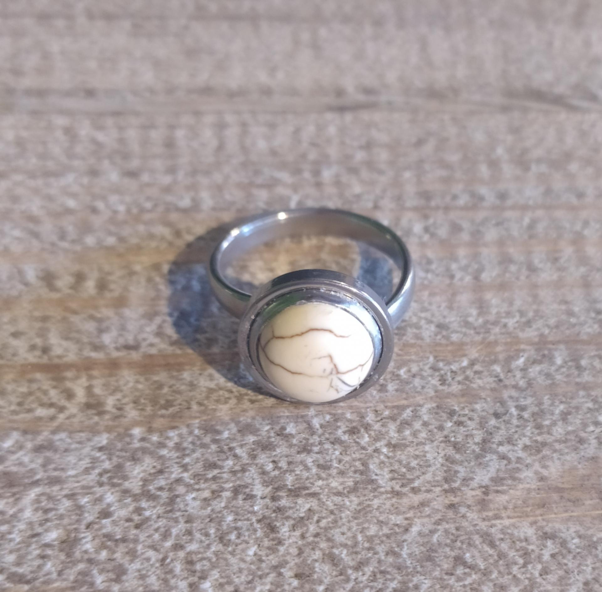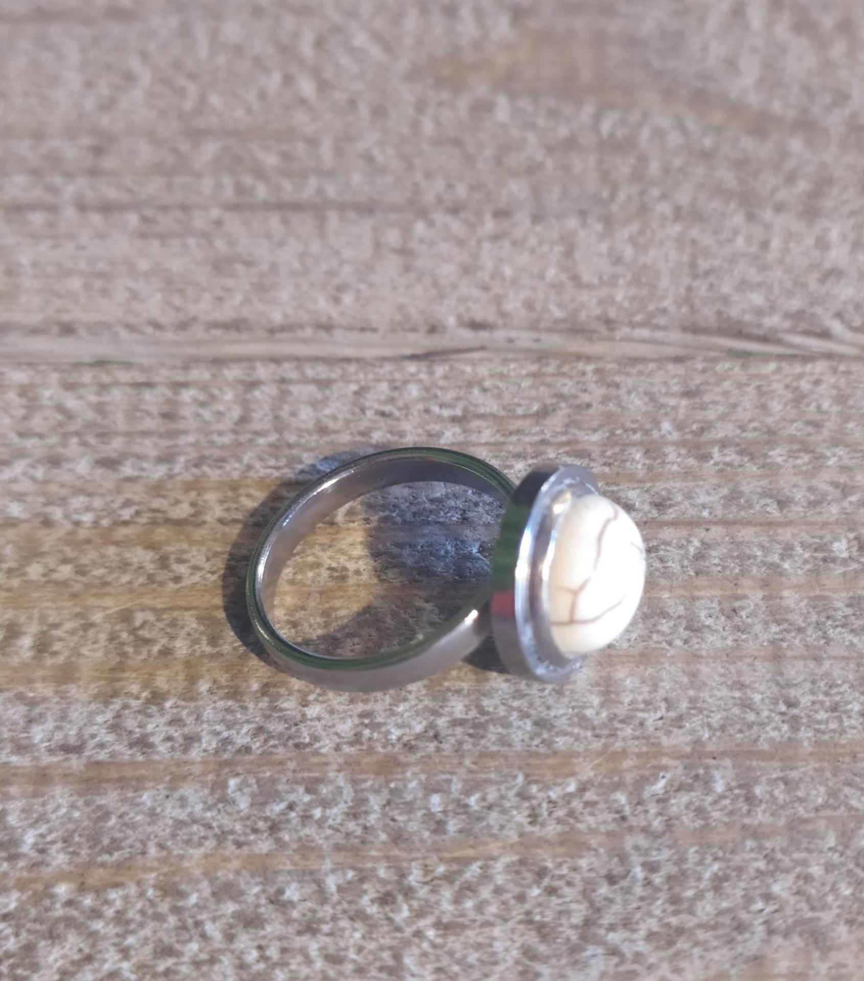 Bague, cabochon rond et pierre naturelle Howlite, acier inoxydable.