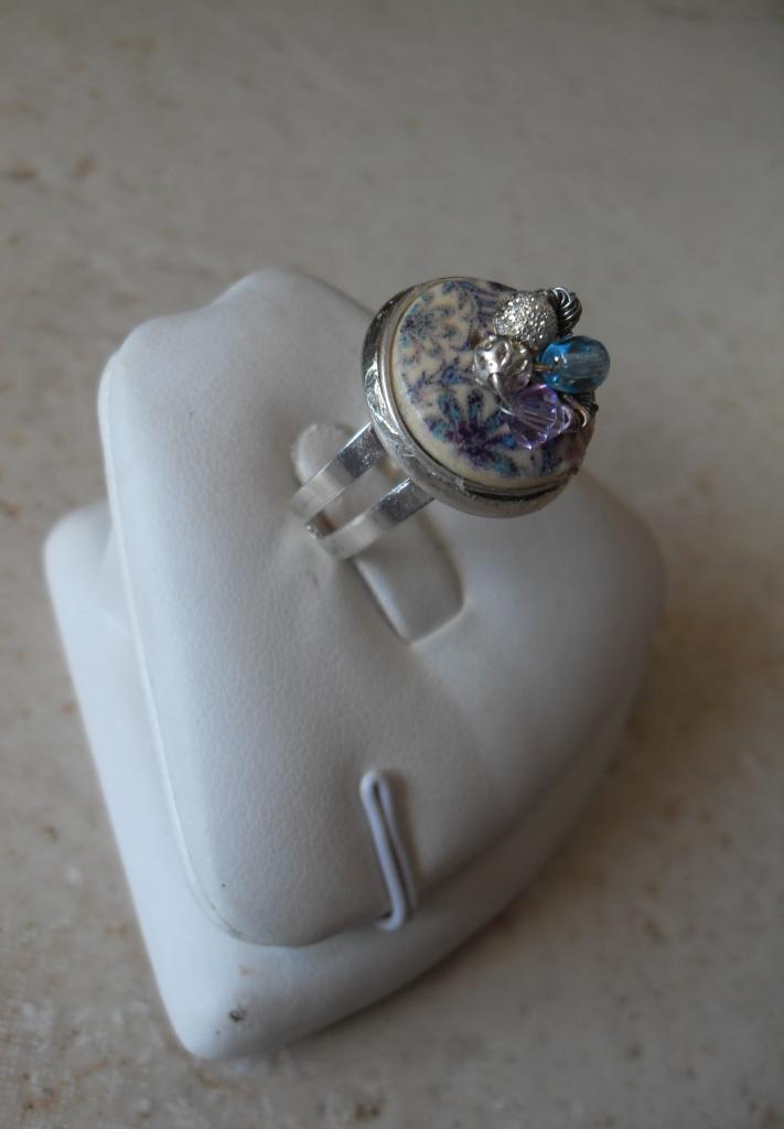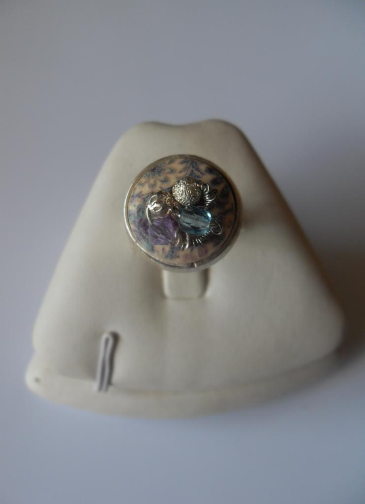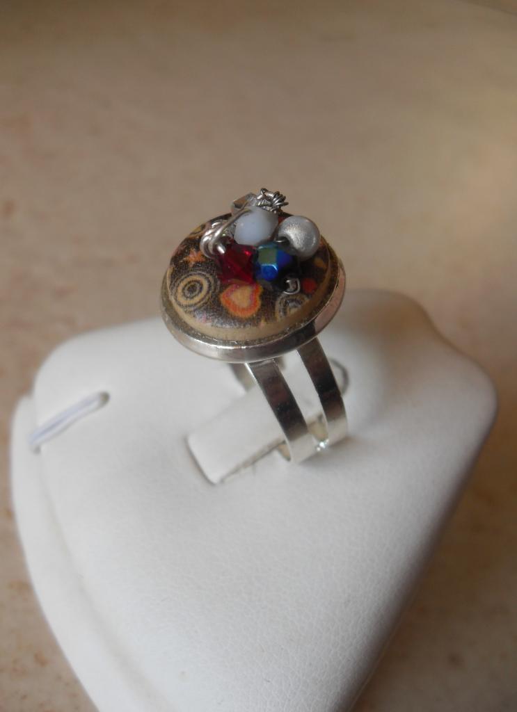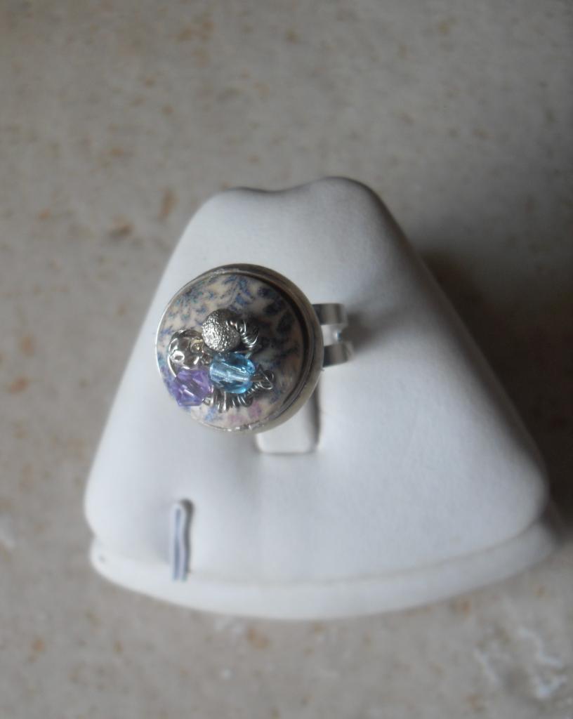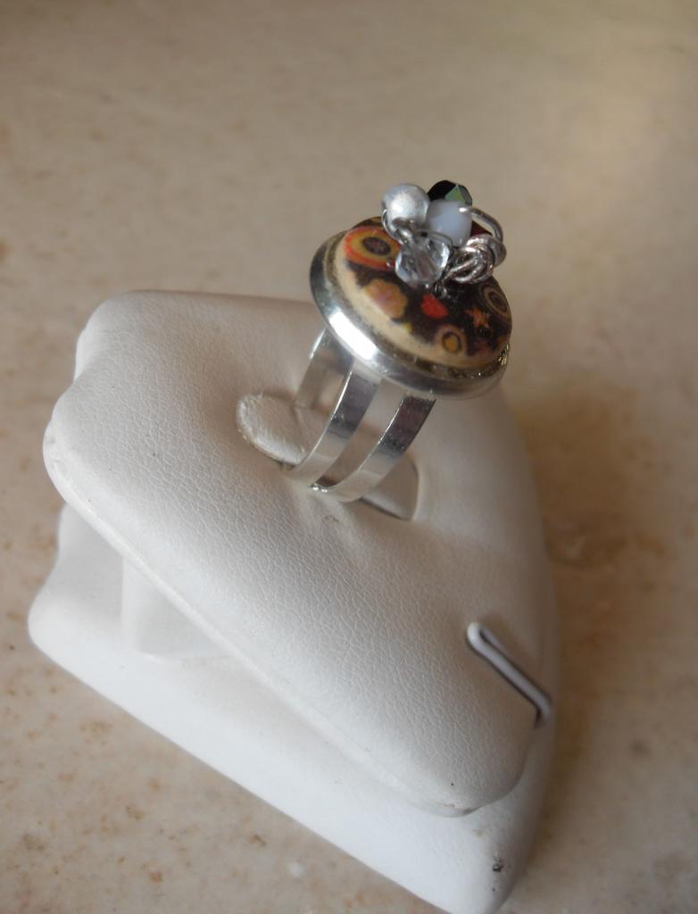 Bague ronde sur métal argenté et son bouton en bois avec motifs de 16mm, recouvert de perles, cristal de swarovski et fil alu.