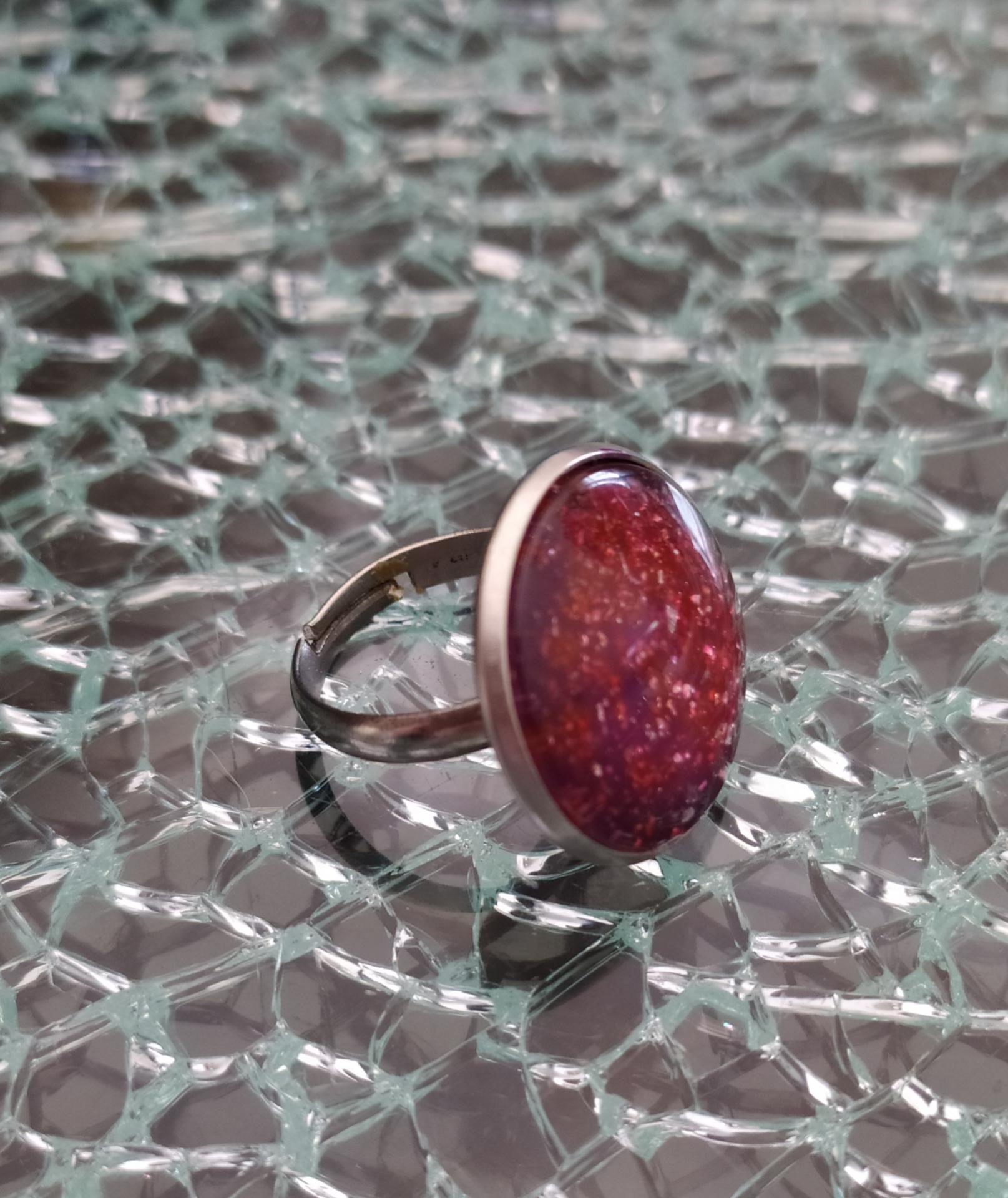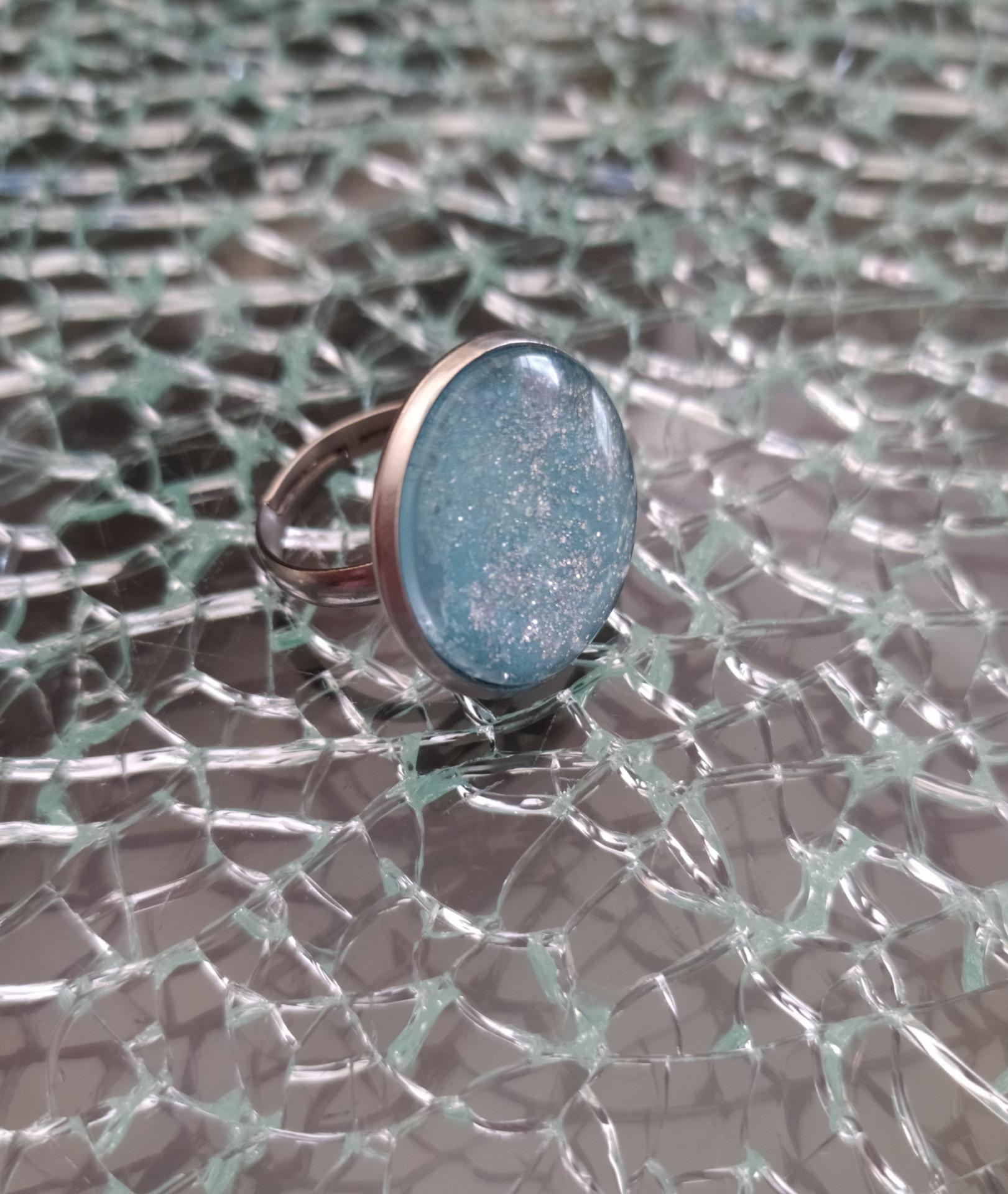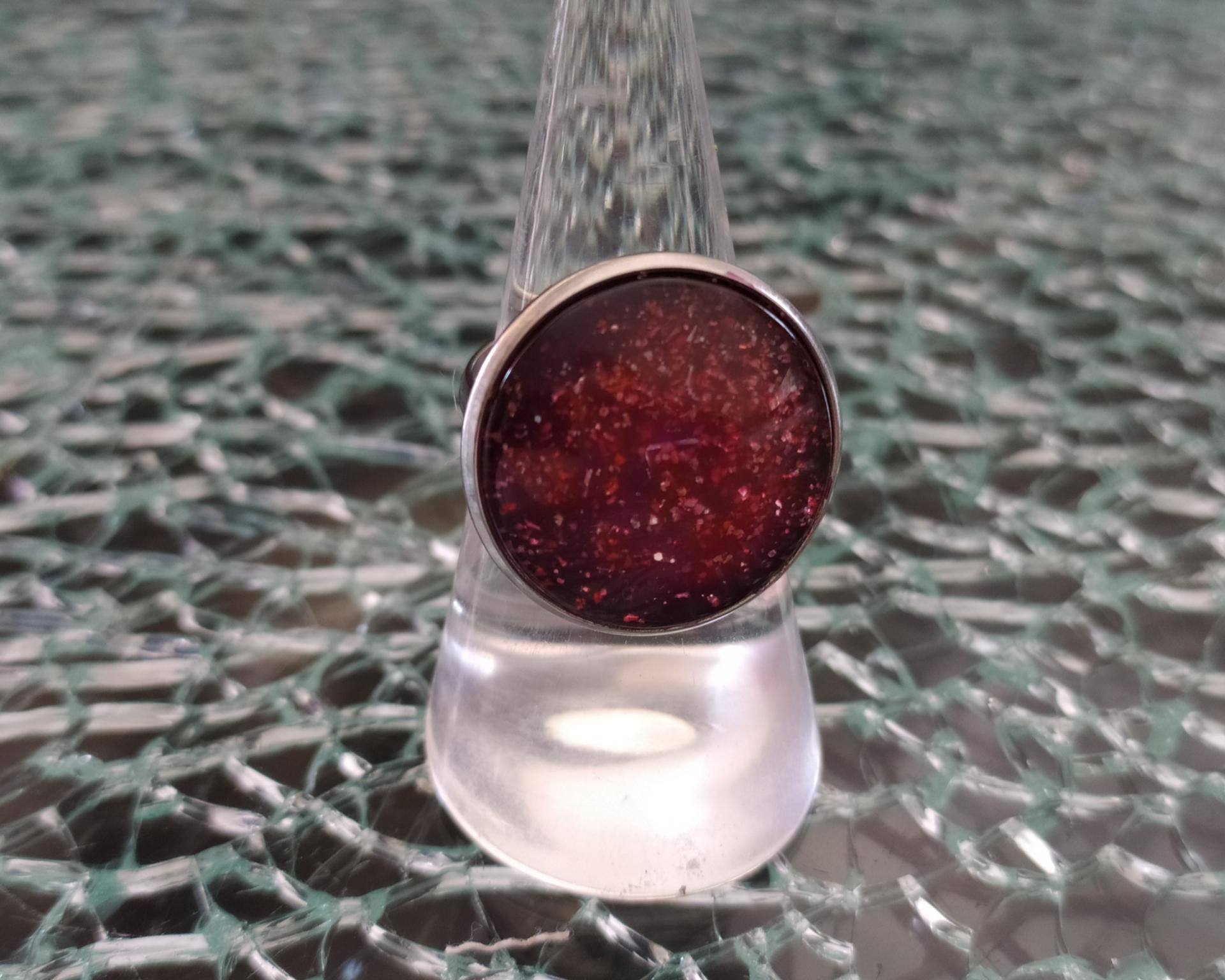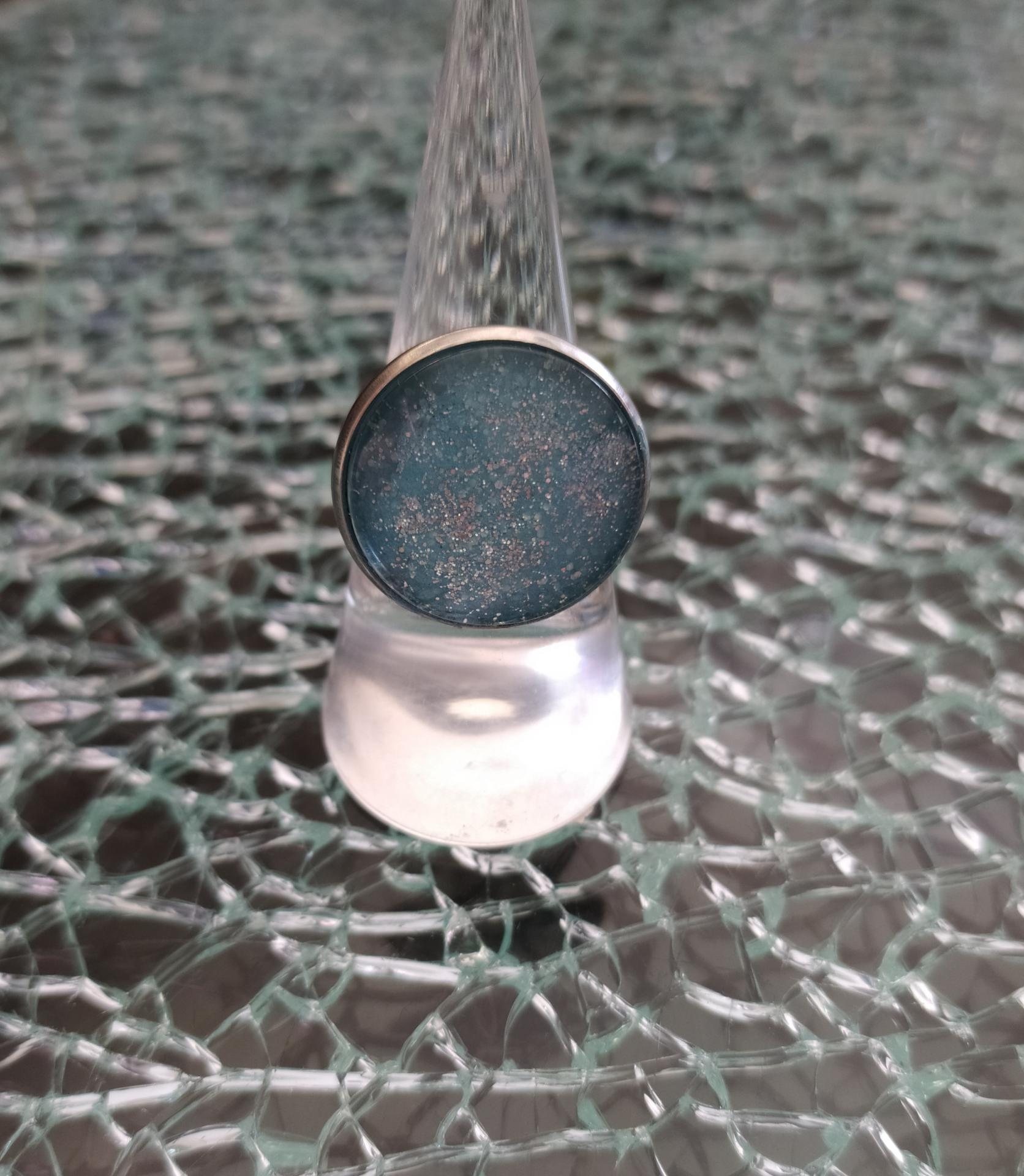 Bague ronde, cabochon de verre et paillettes, acier inoxydable.