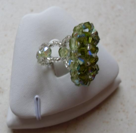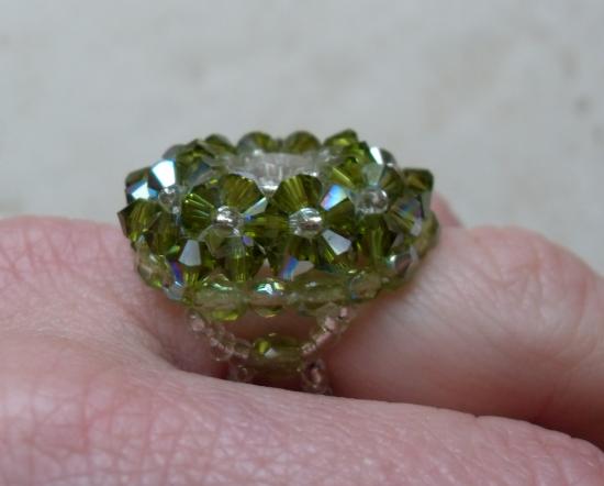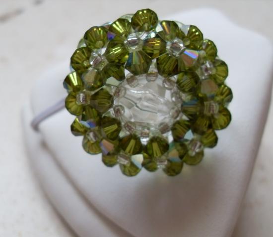 Bague ronde en cristal de swarovski olivine et perle ronde cristal blanc.