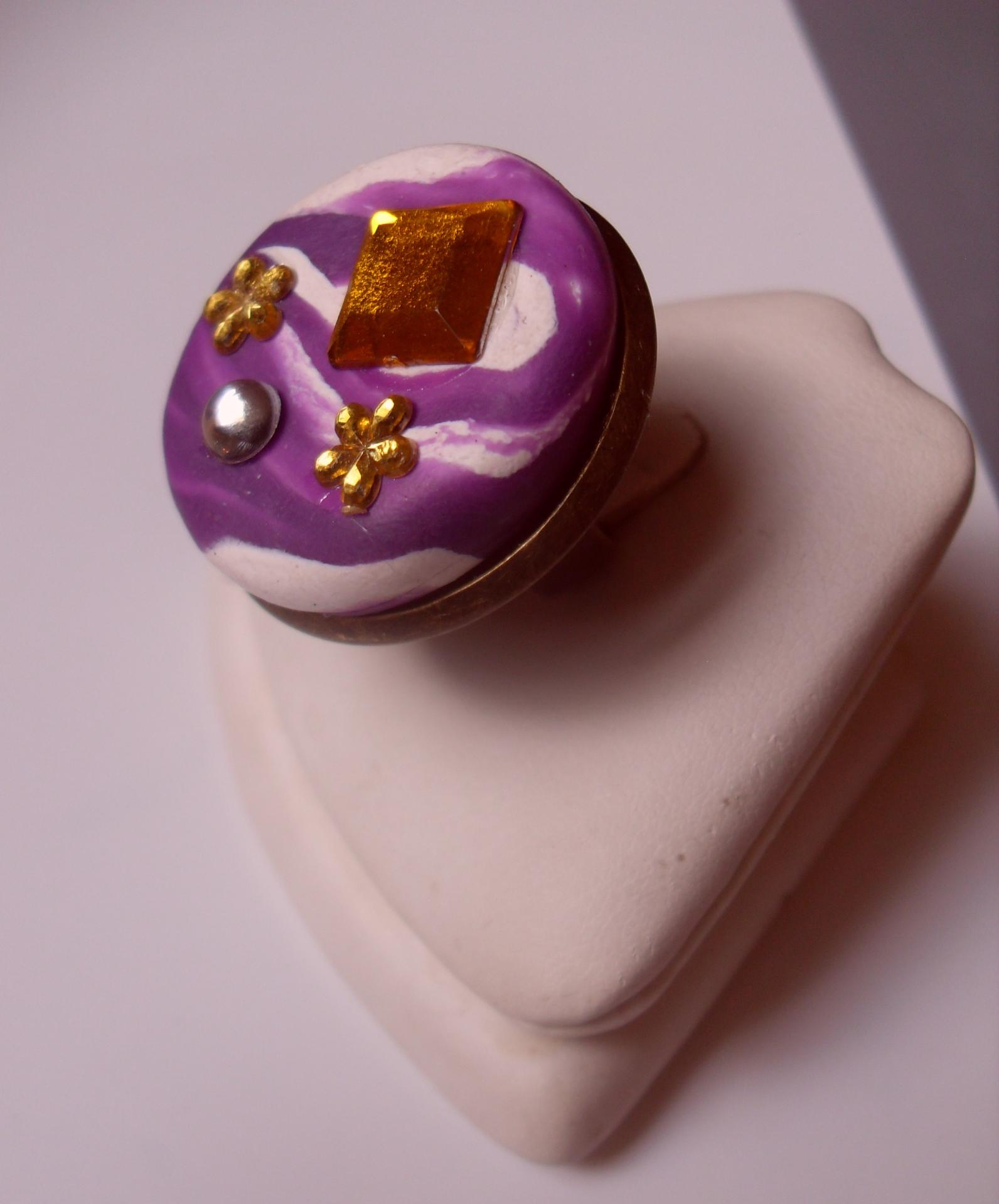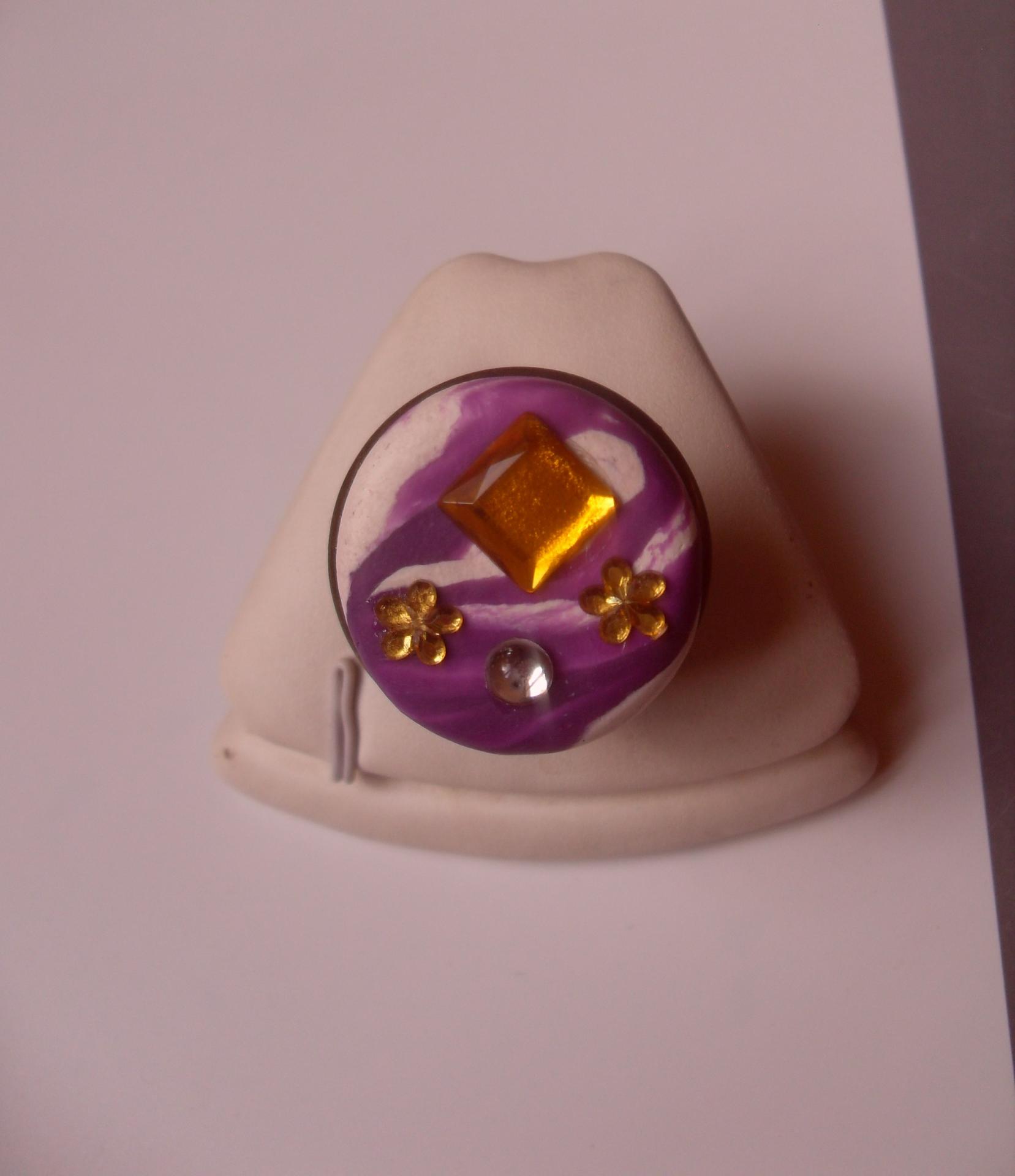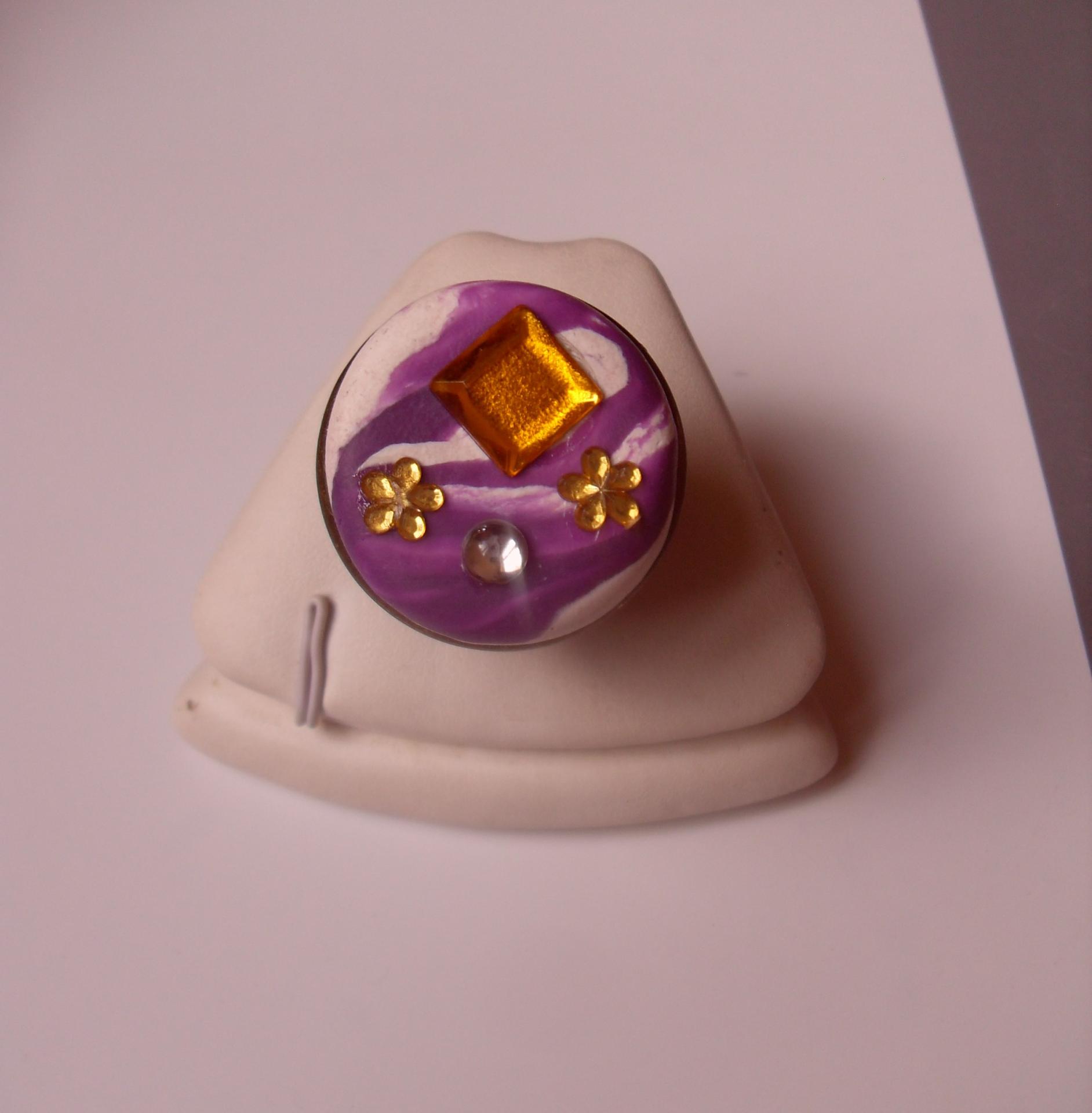 Bague ronde, gros cabochon blanc-violet, carré orange et fleurs strass.