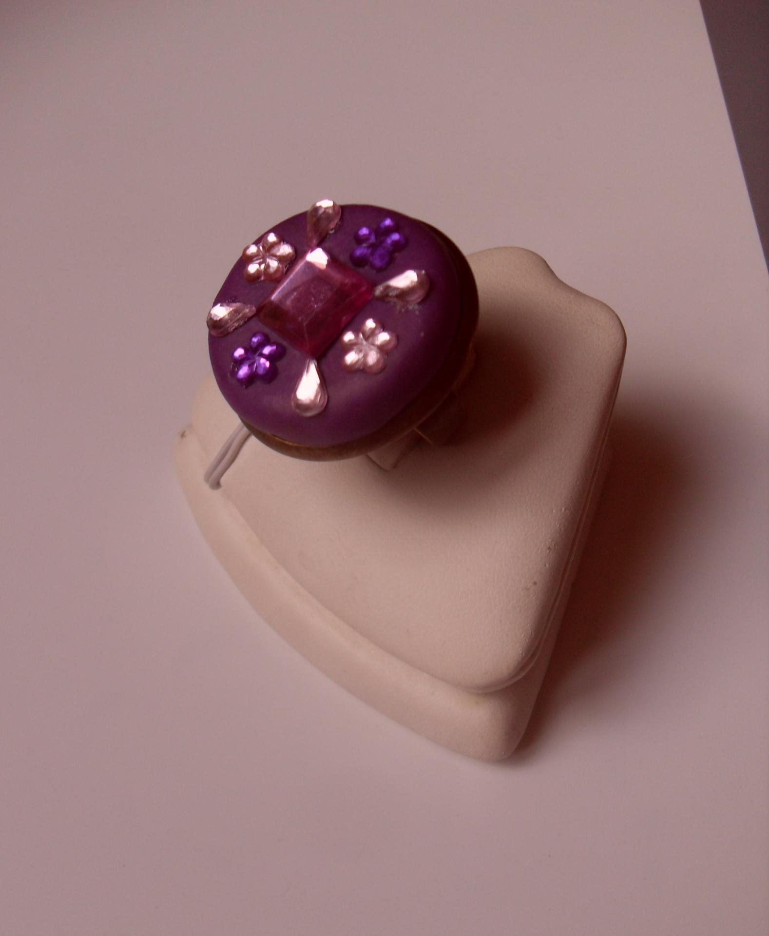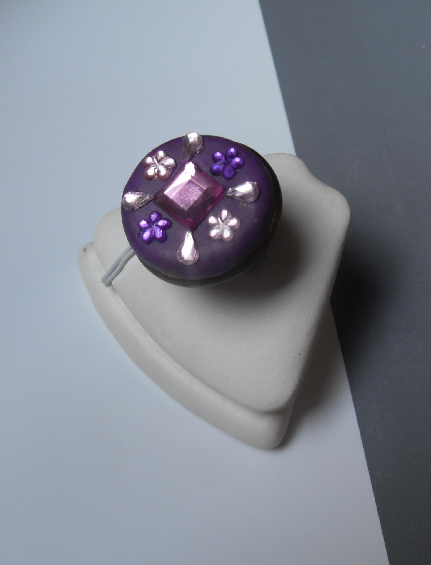 Bague ronde sur métal couleur bronze et son cabochon en fimo violet de 27 mm, recouvert de strass rose et violet.