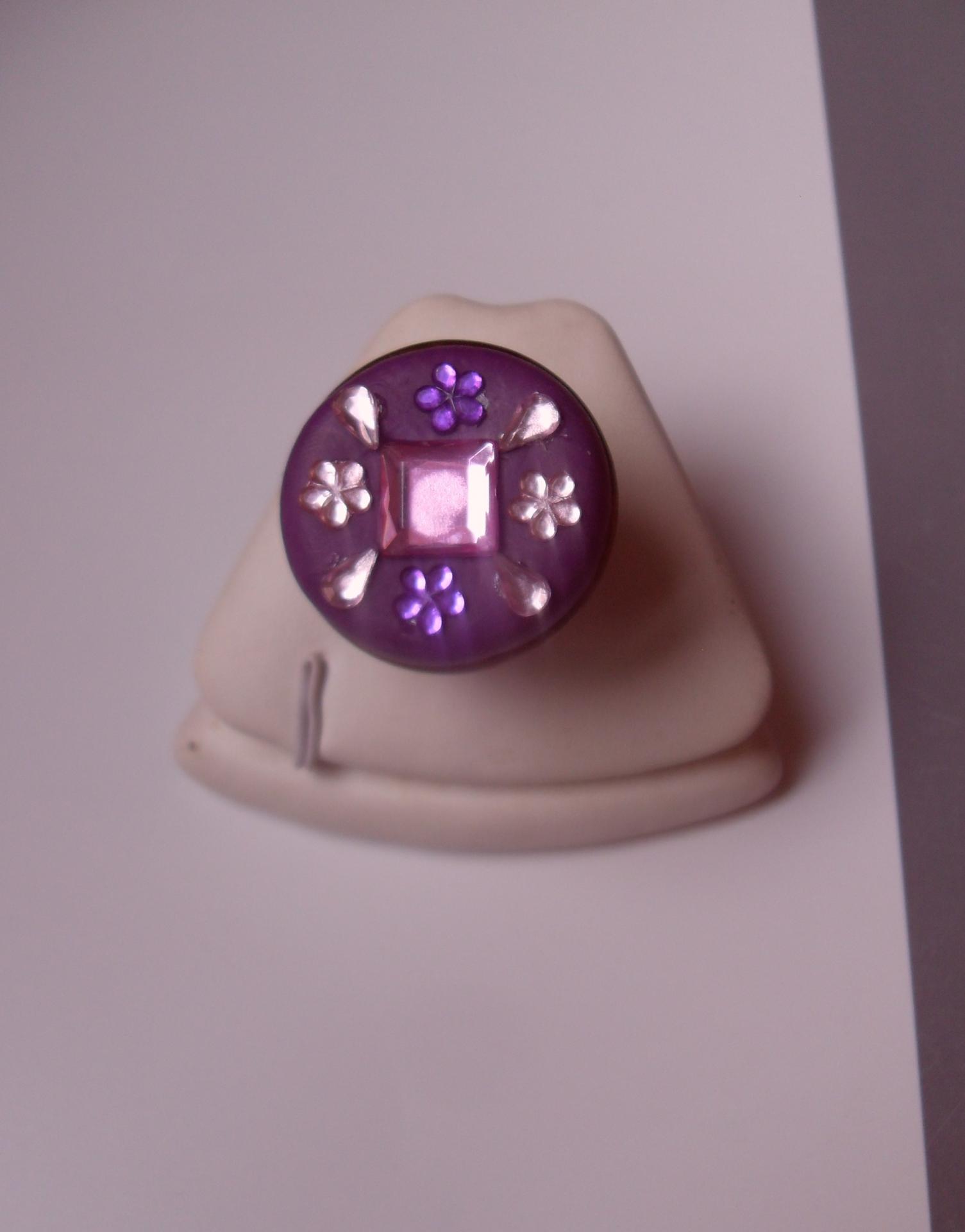 Bague ronde, gros cabochon violet et strass rose-violet.