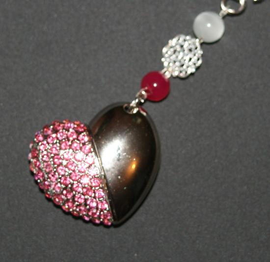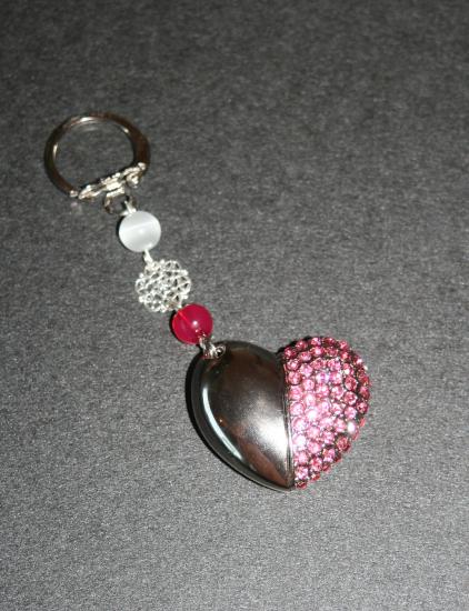 Porte clefs- bijou de sac, clé usb 8 gb, coeur strass rose et perles verre