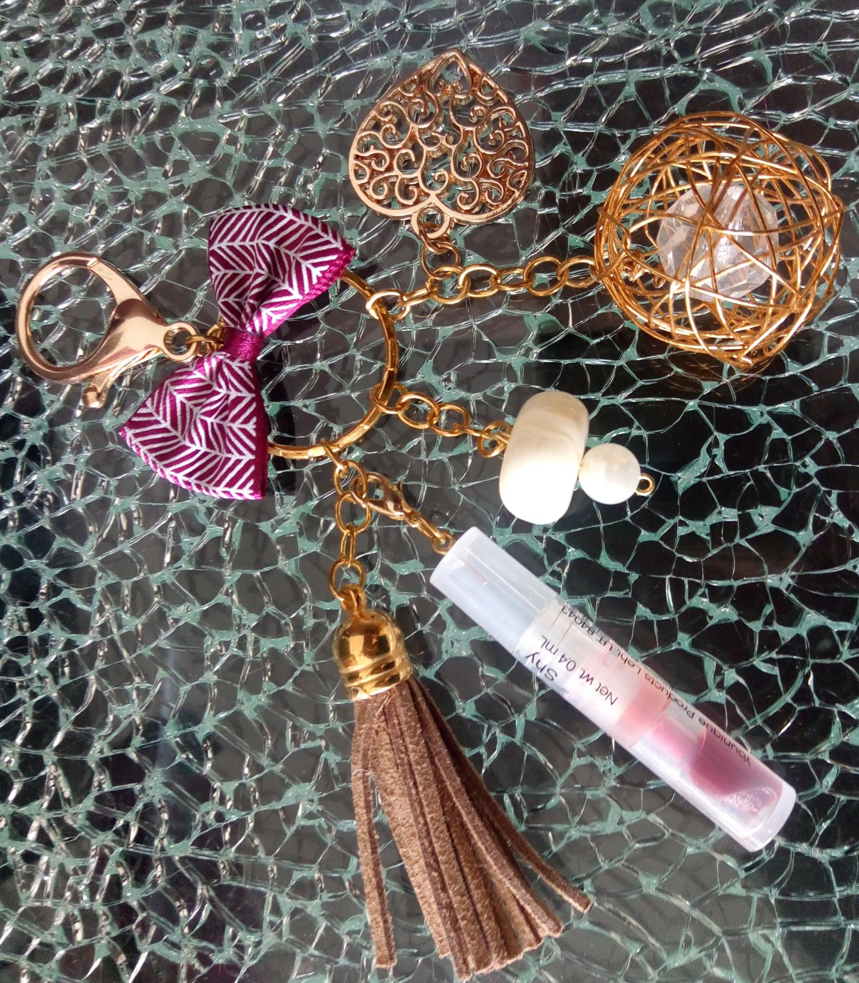 Porte-clés, bijou de sac, noeud, coeurs, pompon marron, perles et gloss à lèvres.