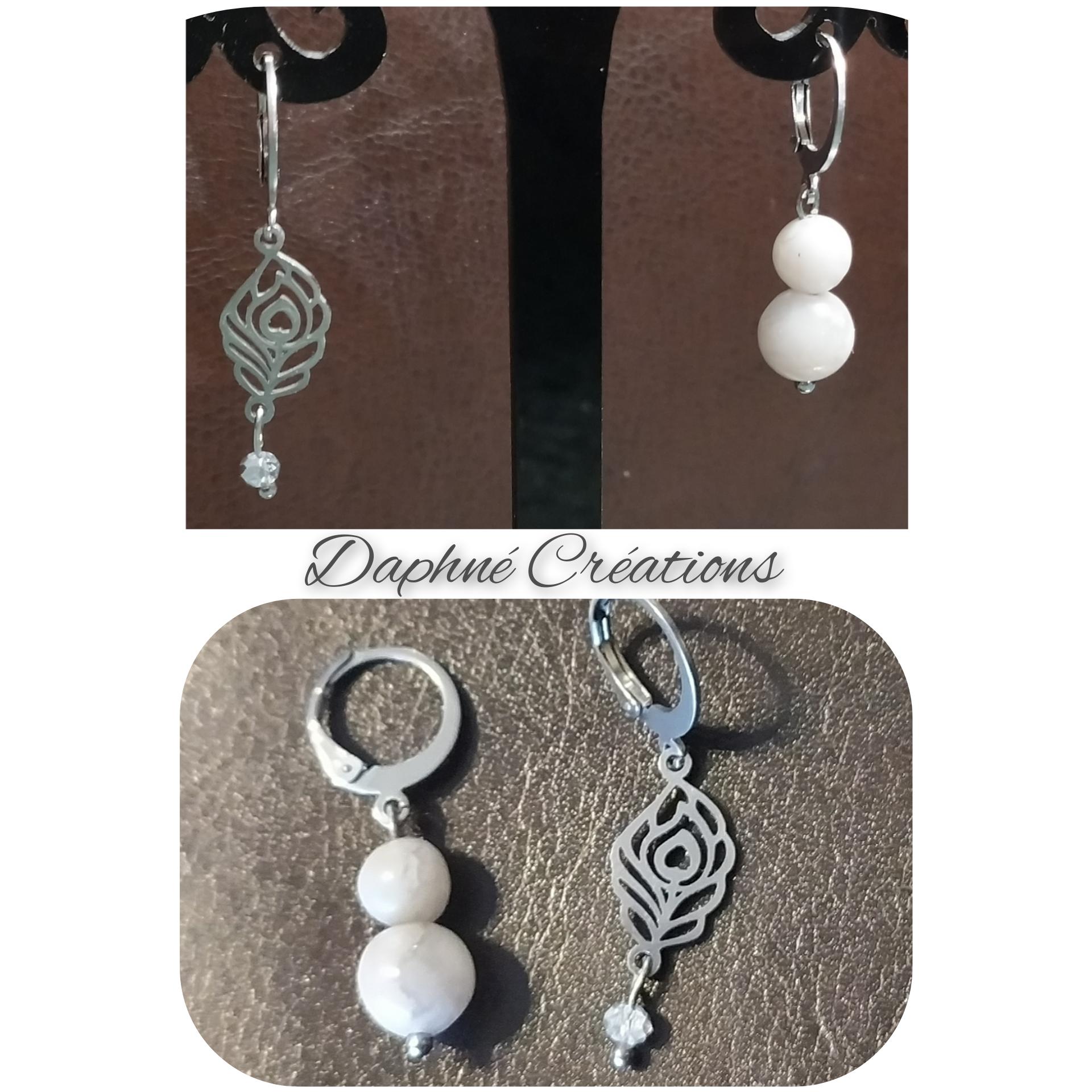 acier inoxydable pendantes fabriqué en france. collection les insolites plumes agates blanches pierre naturelle Daphné créations fait main. création artisanale made in France dormeuse