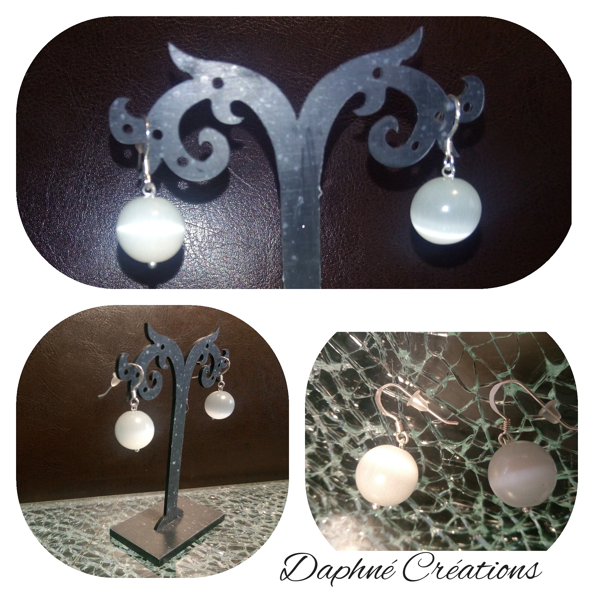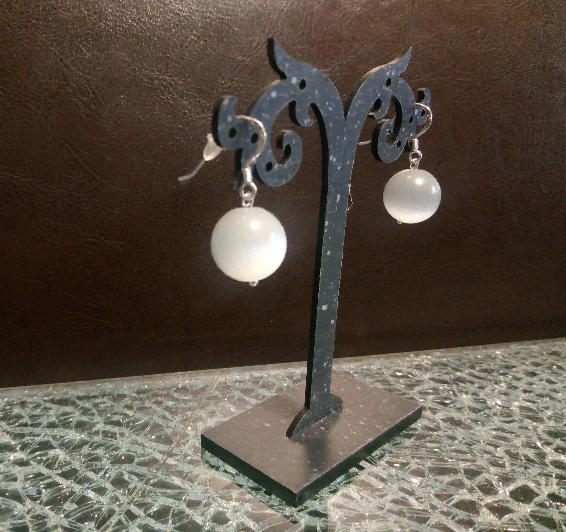 oeil de chat perles argent 925. boules boucles d'oreilles pendantes blanche