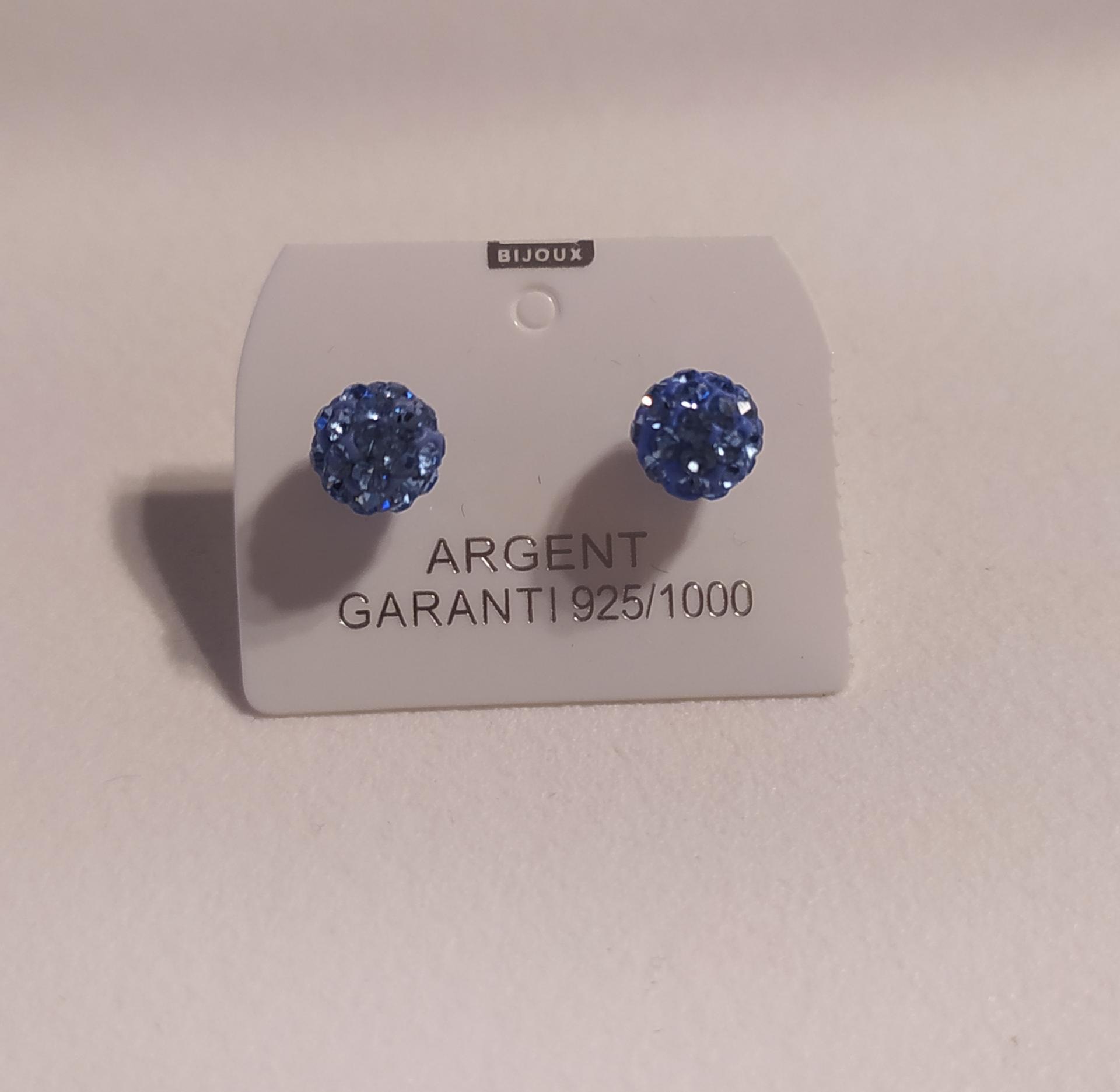 boucles d'oreilles rondes boules oxyde de zirconium strass bleu argent 925. Daphné créations