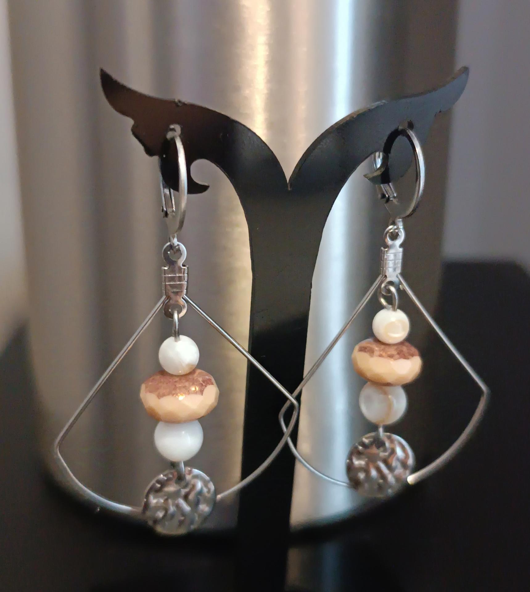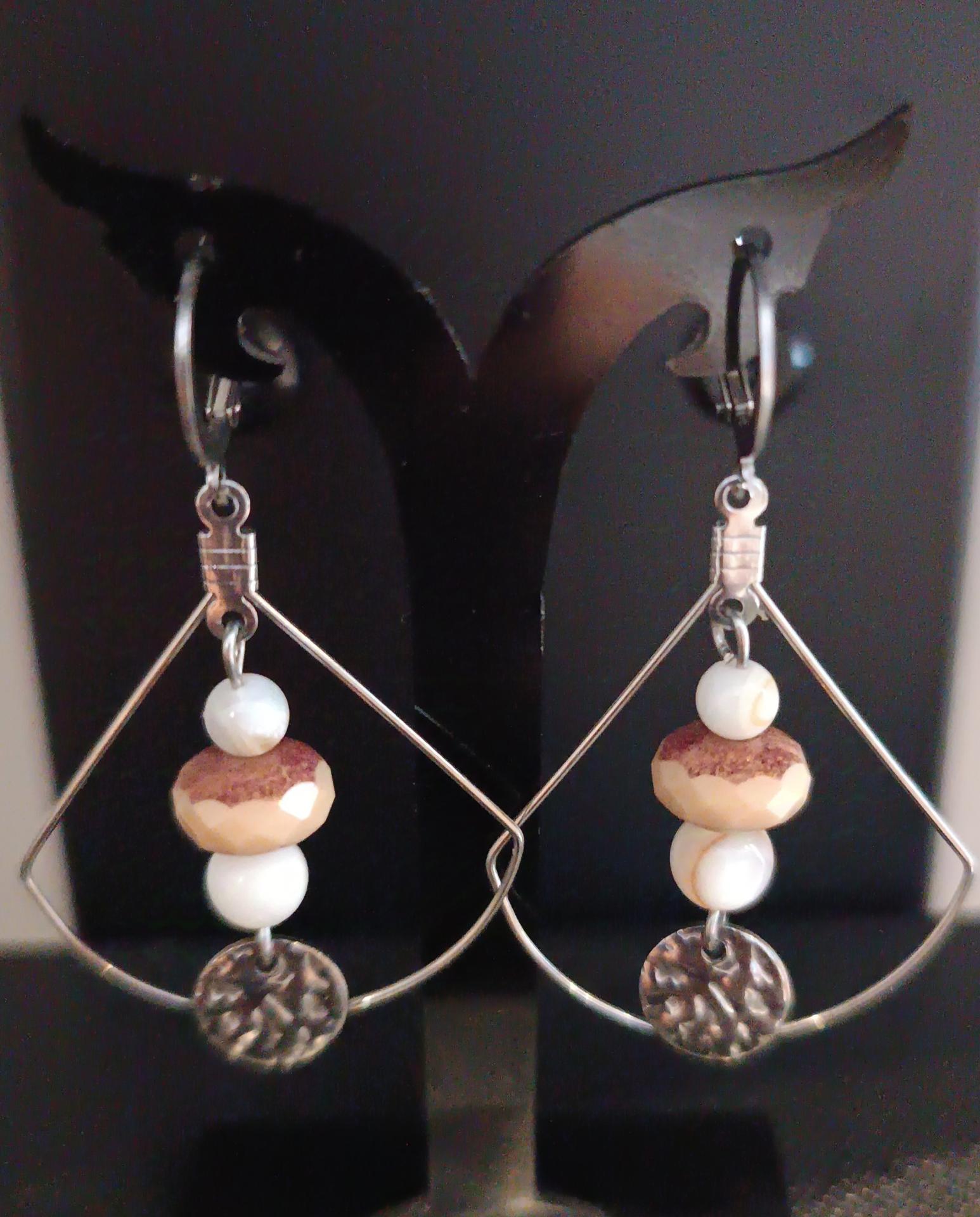 Boucles d'oreilles pendantes, acier inoxydable, pierres naturelles, cristal de swarovki marron et pampille martelée.