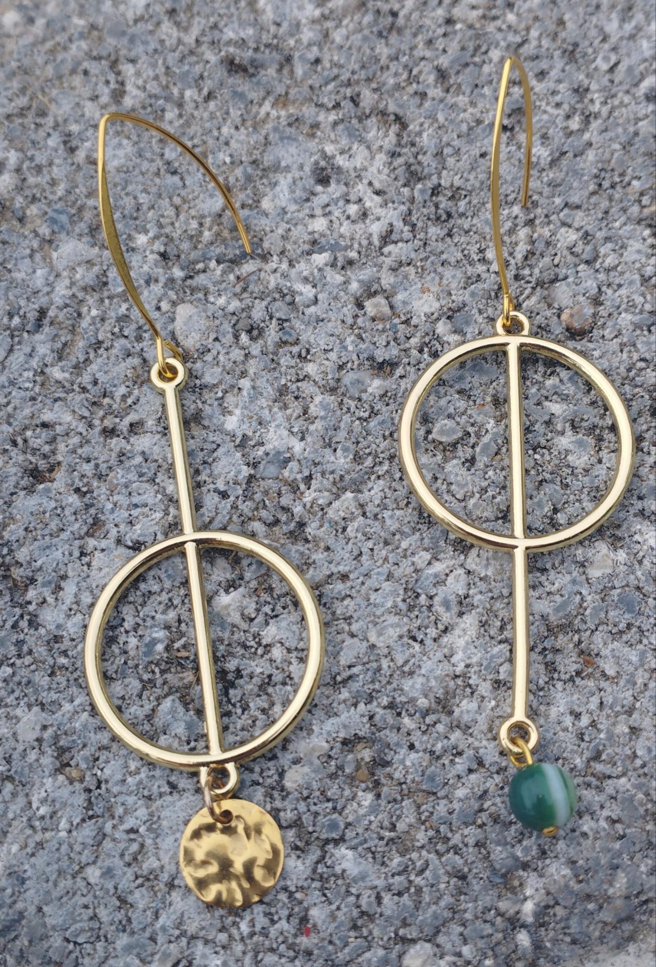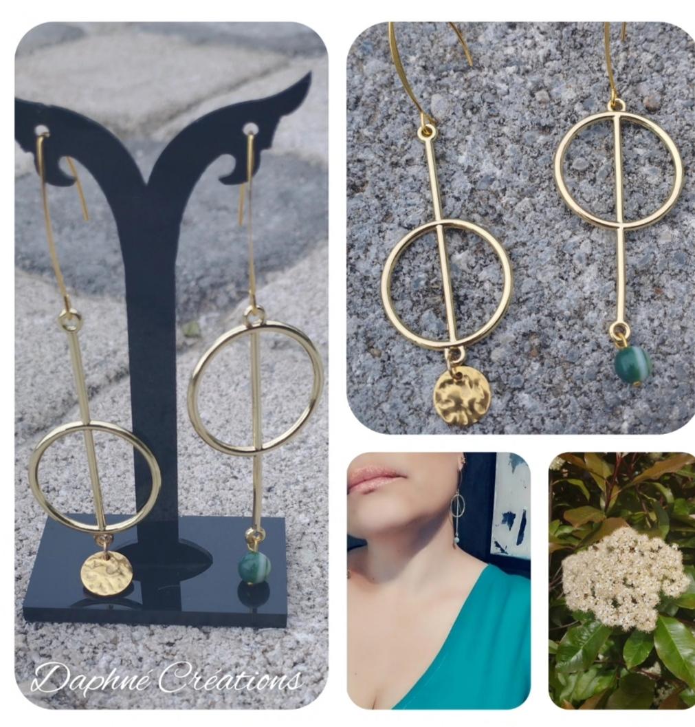 Boucles d'oreilles pendantes, dorées en acier inoxydable, de la collection "les insolites", pampilles et pierre naturelle agat vertes.