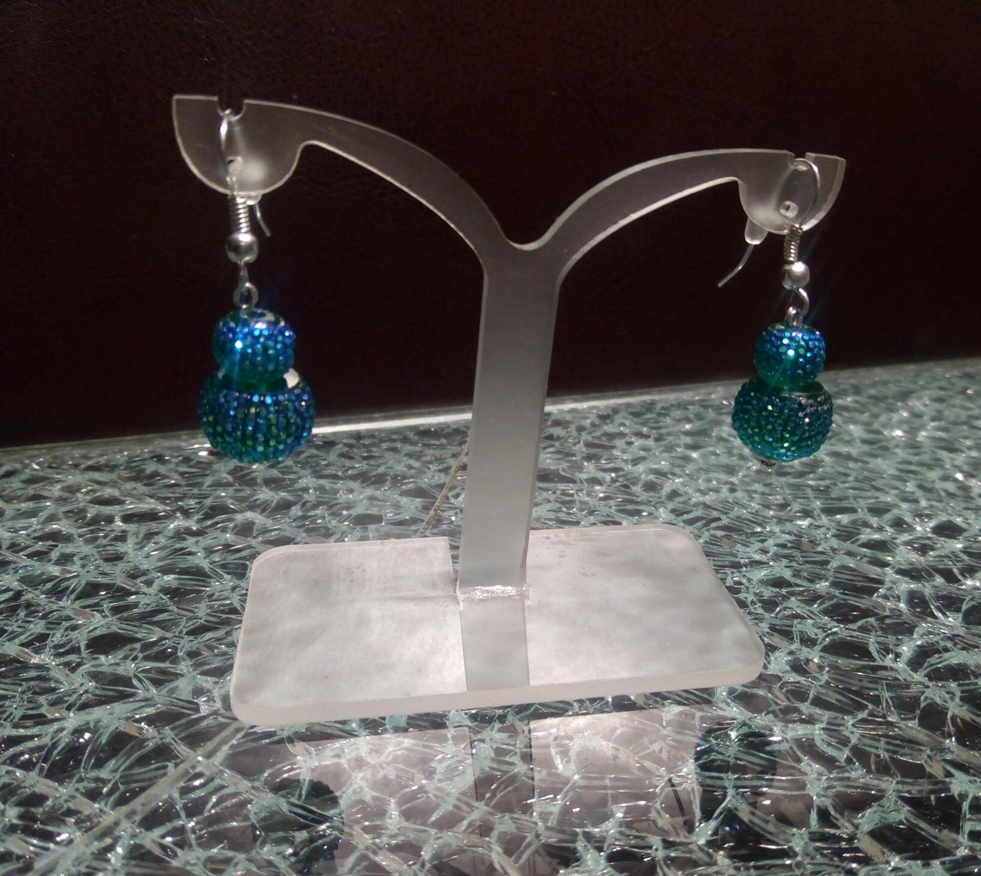 Boucles d'oreilles, pendantes, 2 perles résine effet strass dans les tons de bleu.