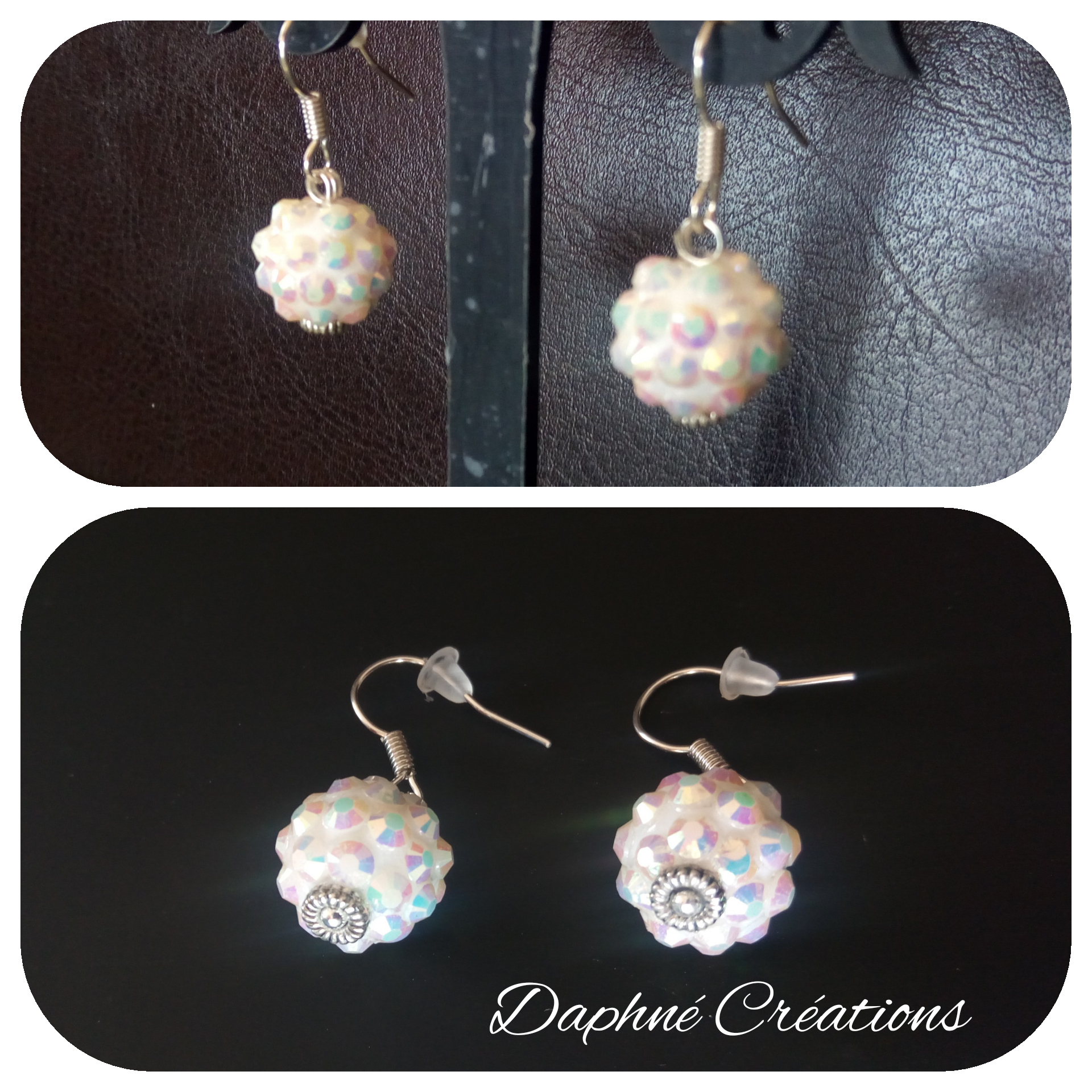 Boucles d'oreilles perles blanches et strass, création artisanale made in France Daphné créations.