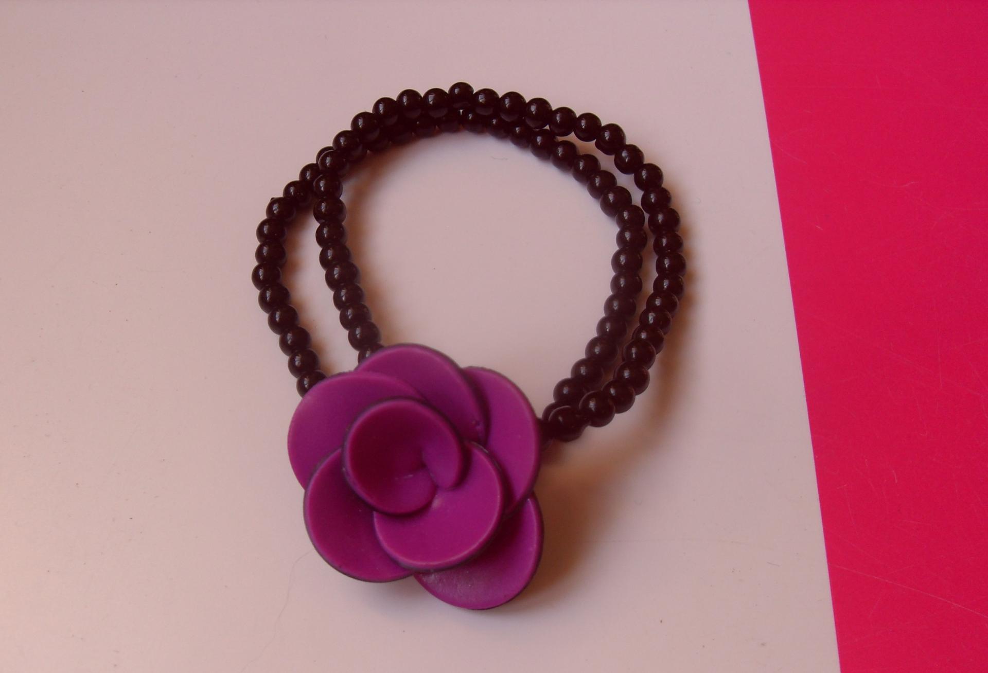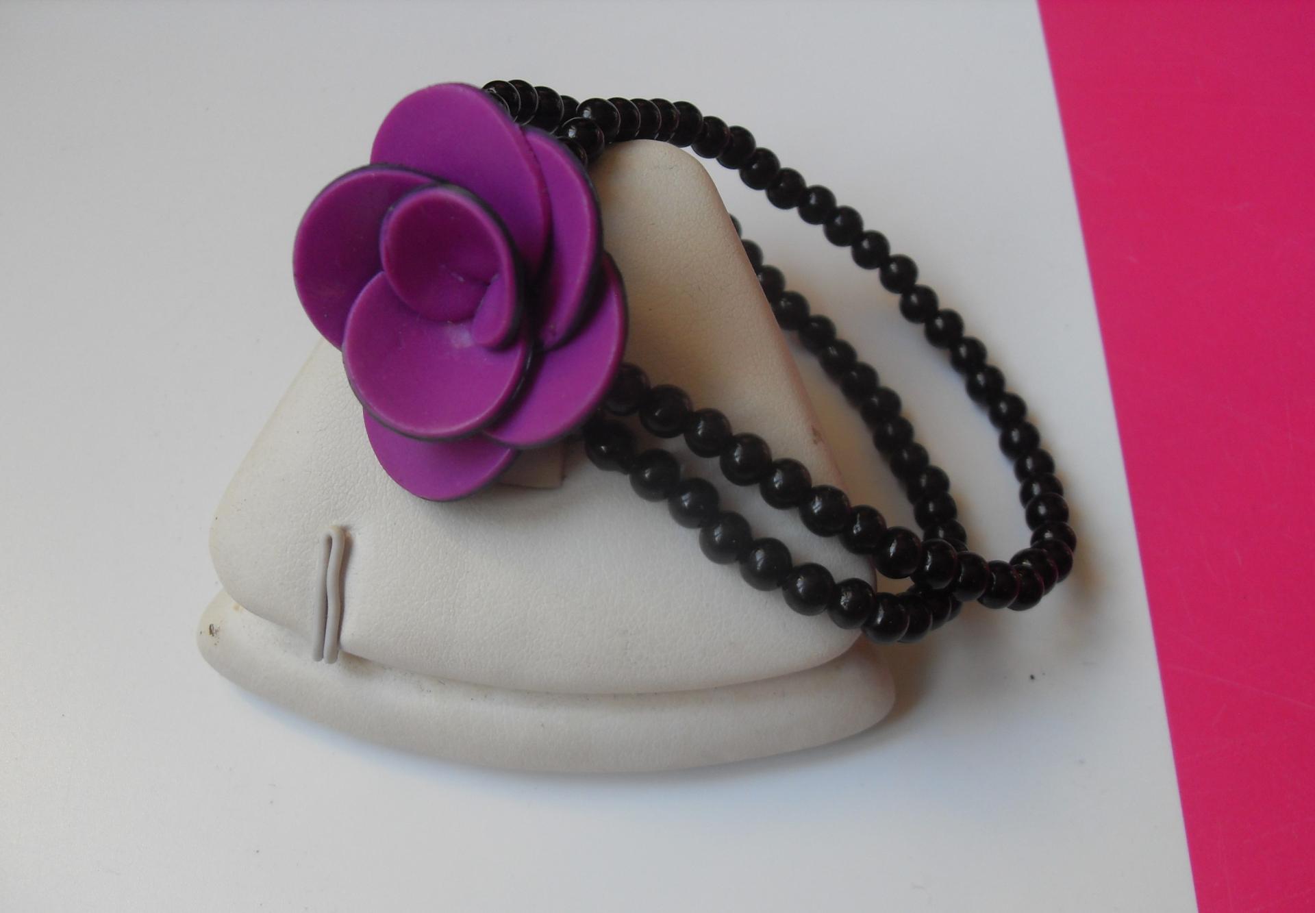 Bracelet élastiqué en perles noires et sa fleur rose.