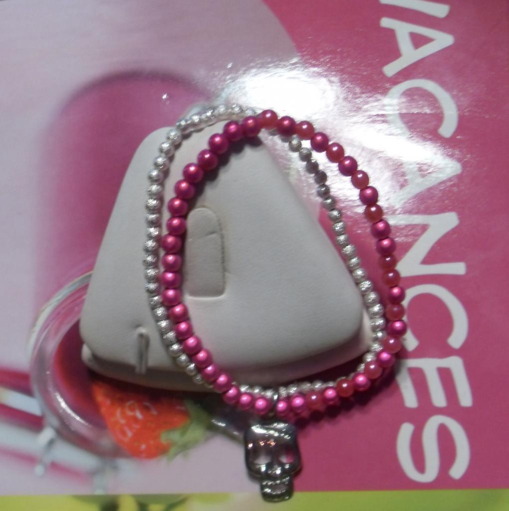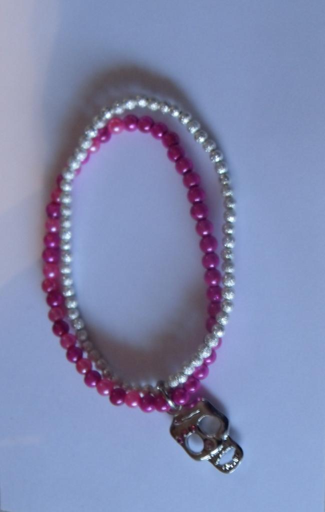 Bracelet 2 rangs rose-argenté et sa breloque tête de mort.