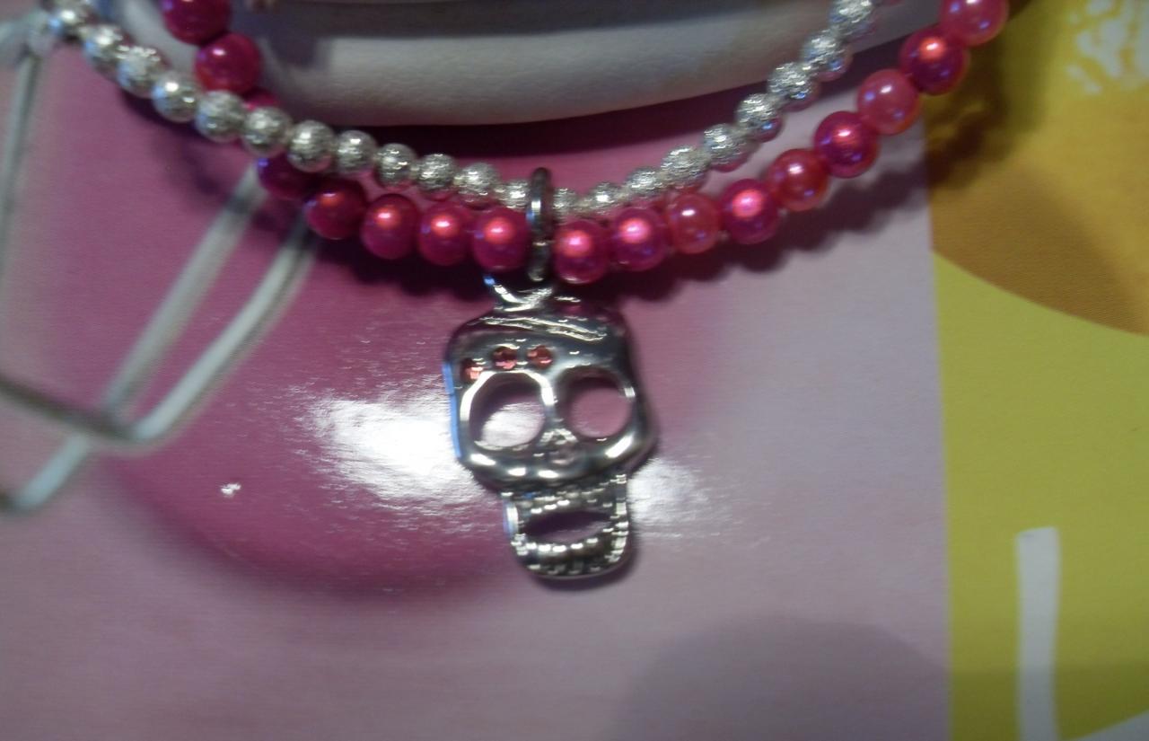Avec sa breloque tête de mort en métal argenté et ses strass roses.