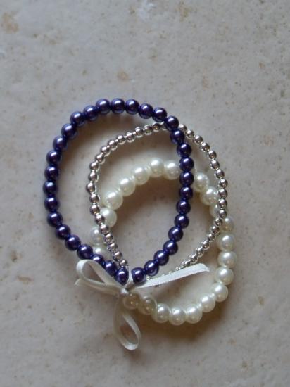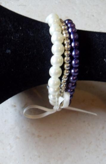 Bracelet 3 rangs de perles imitation culture blanches et prune et perles métal argenté.