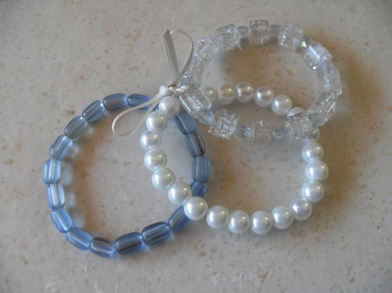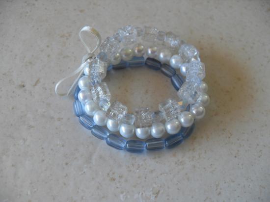 Bracelet 3 rangs de perles, blanc imitation perle de culture et ton bleu, reliés par un ruban blanc.