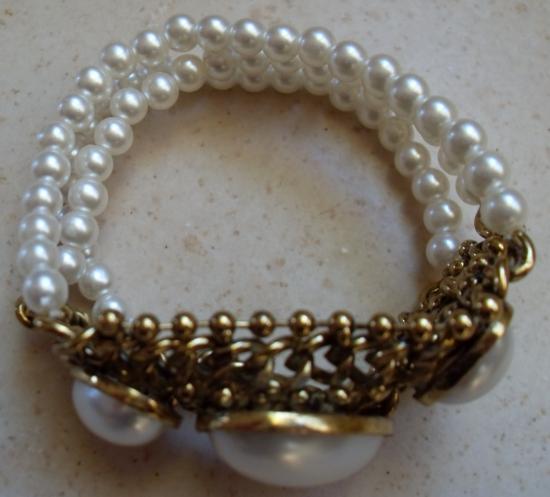 Bracelet élastiqué, 3 rangs imitation perles de culture et maille et perles plates.