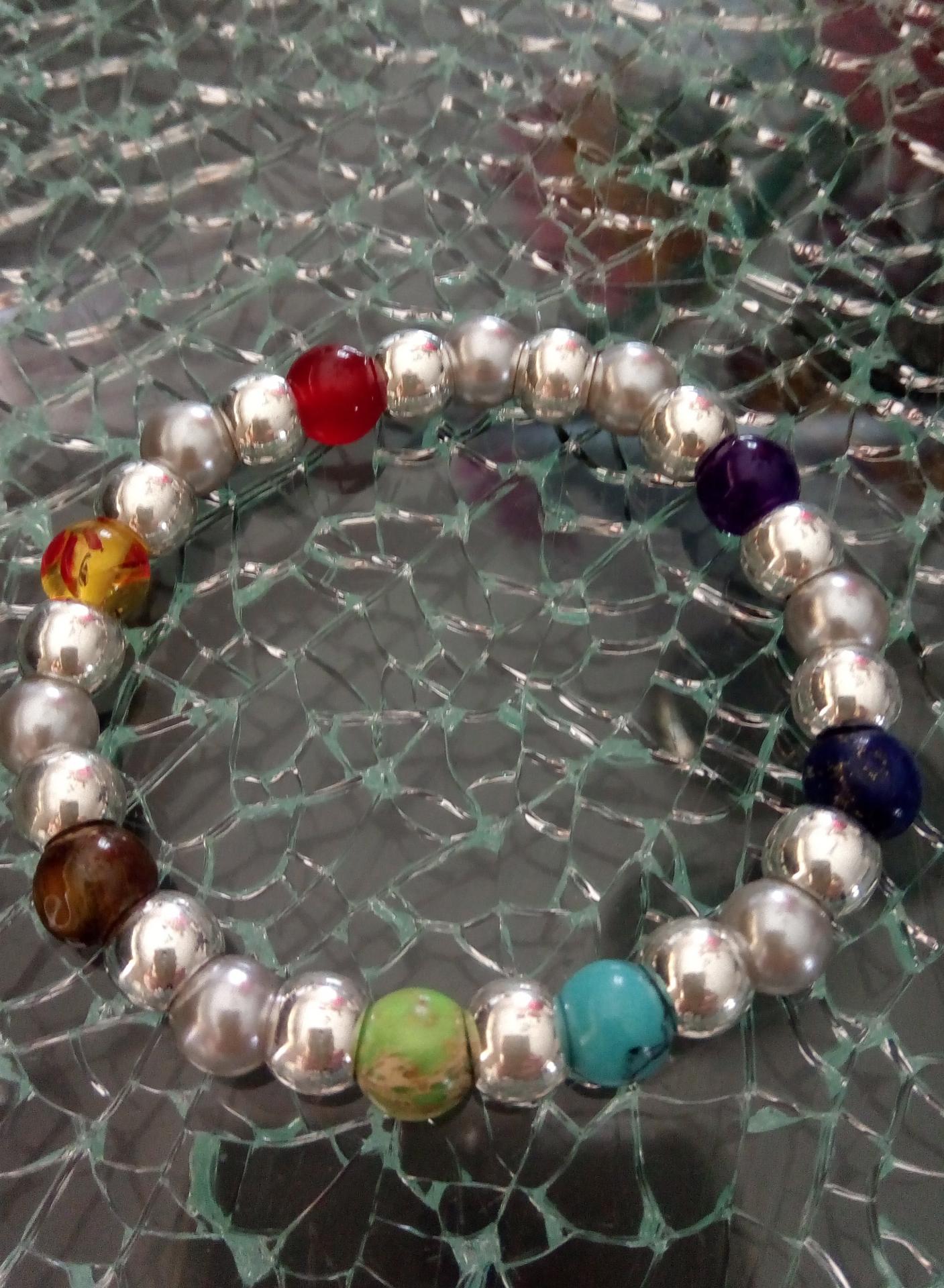 Bracelet perles, argenté, 7 chakras, élastiqué.