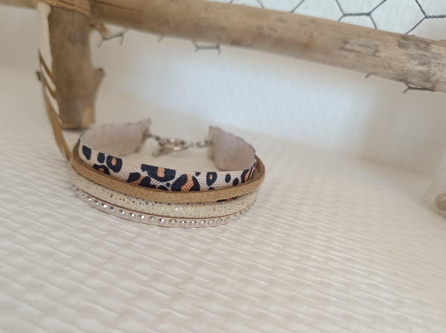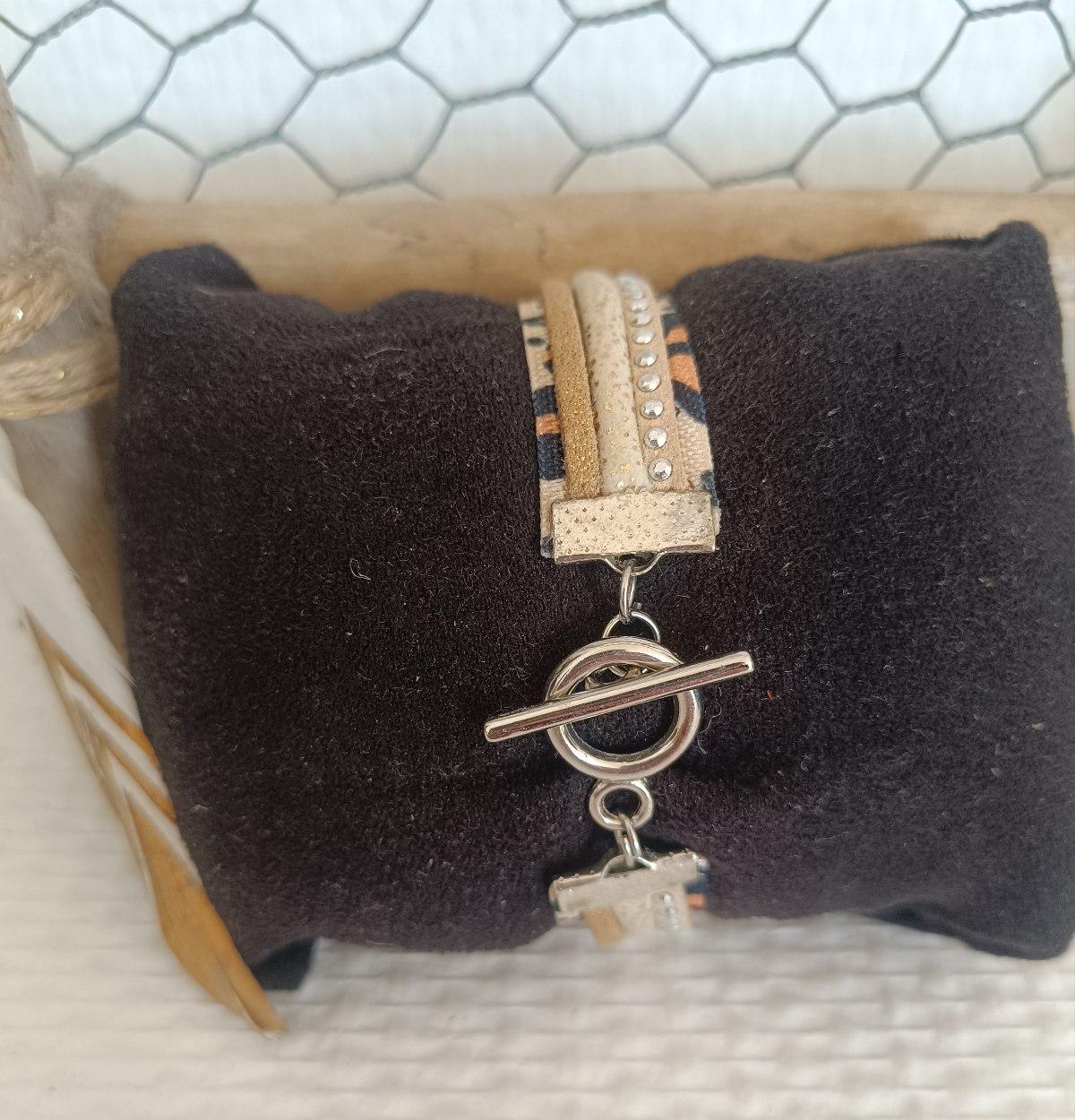 Bracelet beige&léopard, lanières cuir-tissu et fermoir T, création artisanale Daphné créations