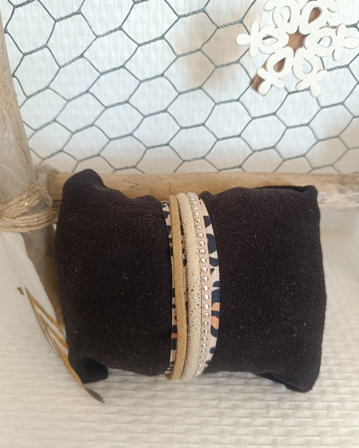 Bracelet beige&léopard lanières cuir-tissu et fermoir T
