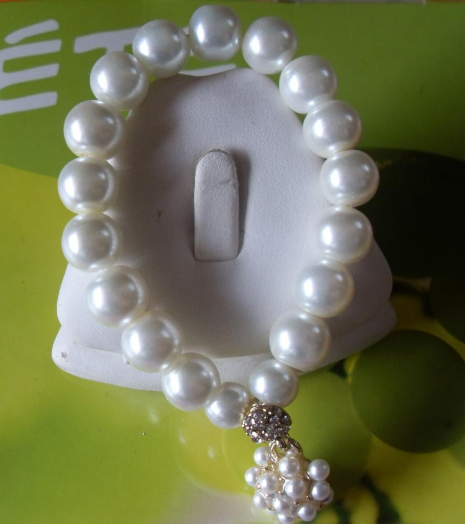 Bracelet élastiqué, longueur 20 cm environ. En perles imitation perles de culture et sa breloque.