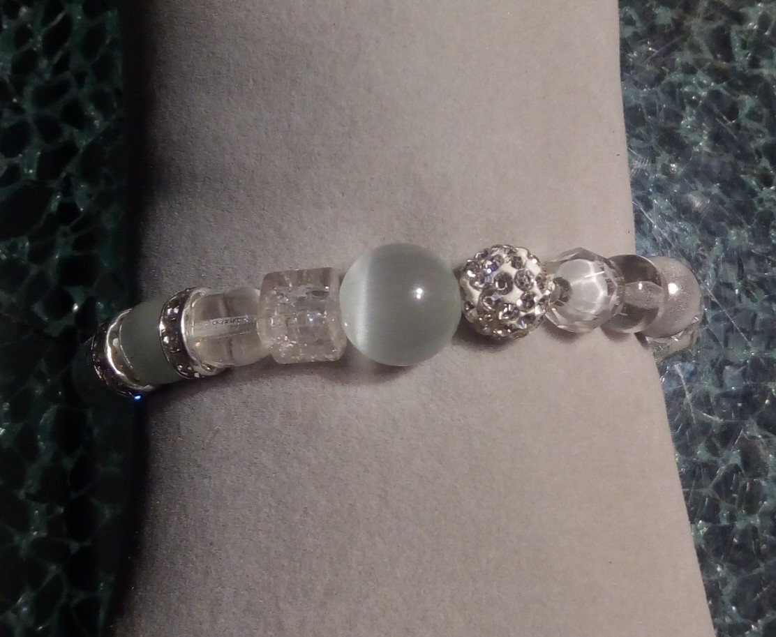 perles magiques made in France création unique élastiqué verre oeil de chat et cristal de swarovski strass blanc bracelet