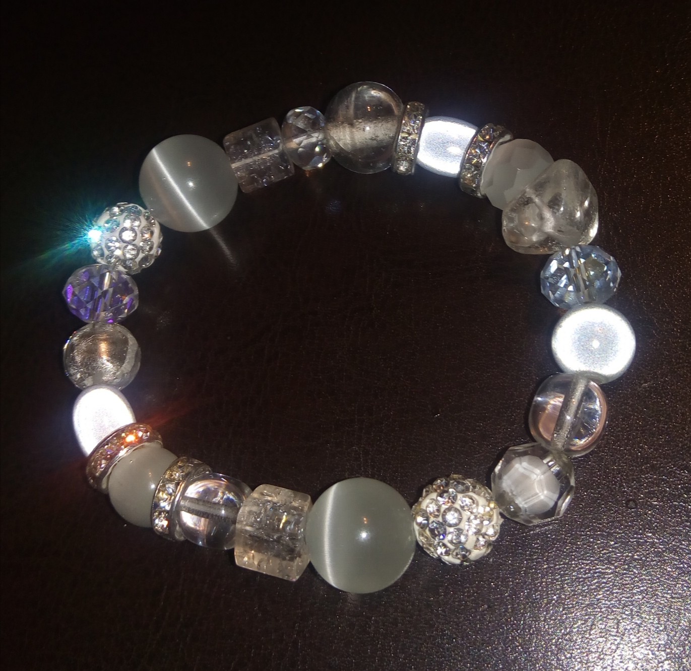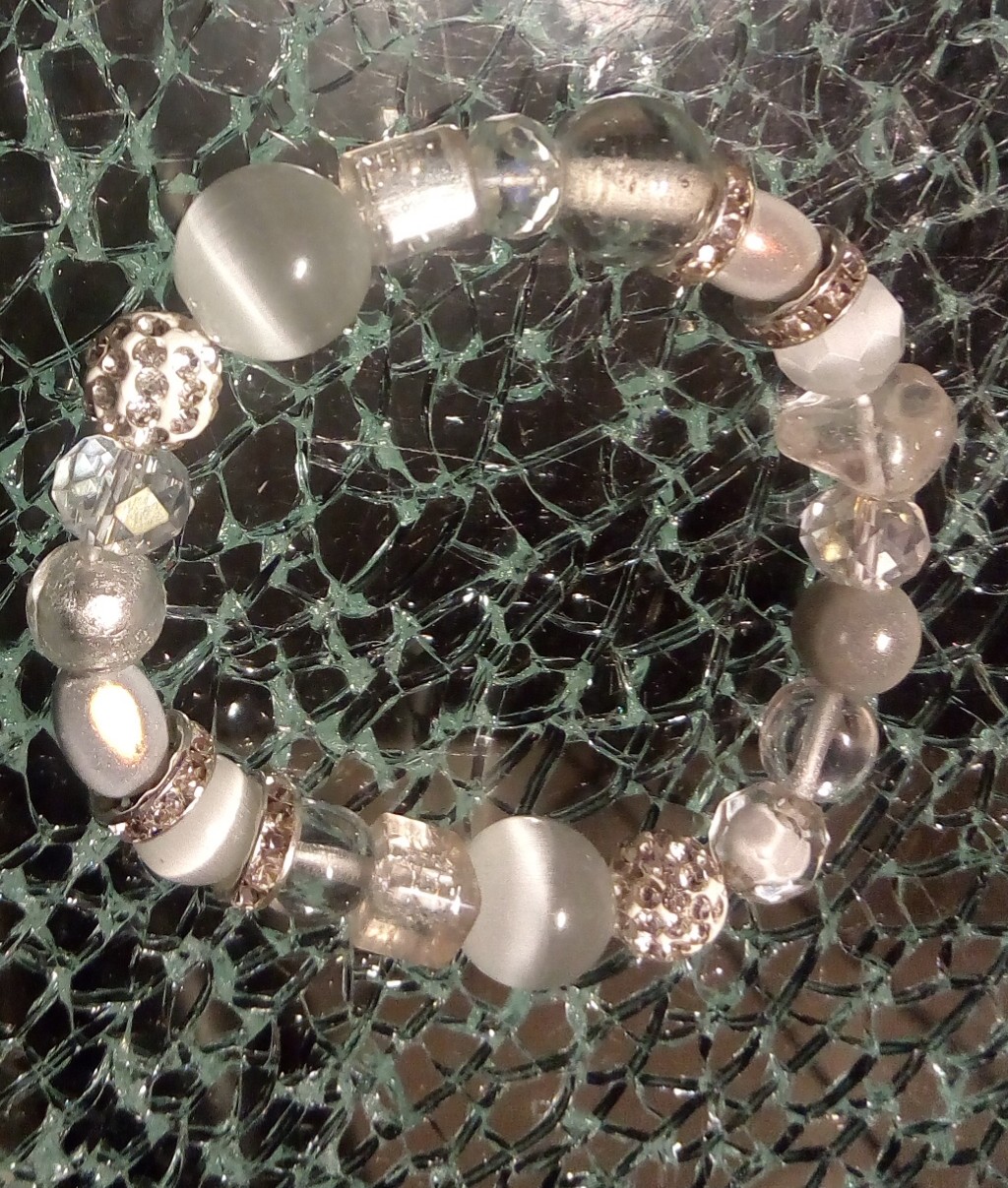 Bracelet blanc, strass, perles magiques, cristal de swarovski, oeil de chat et verre.