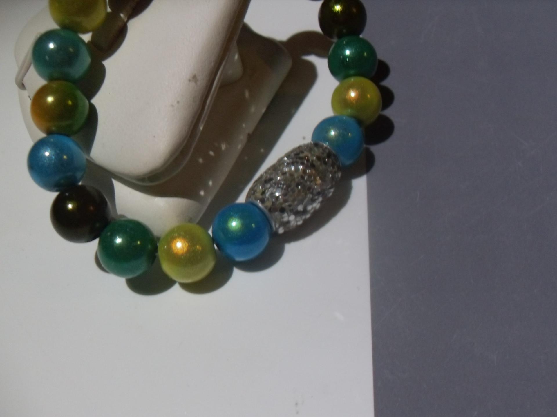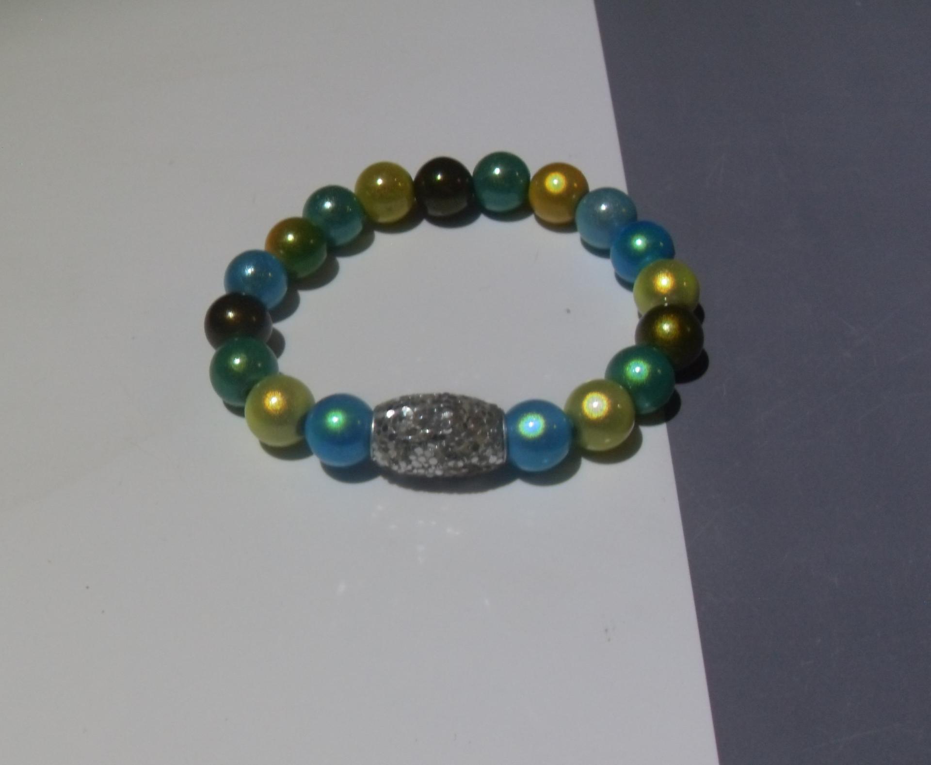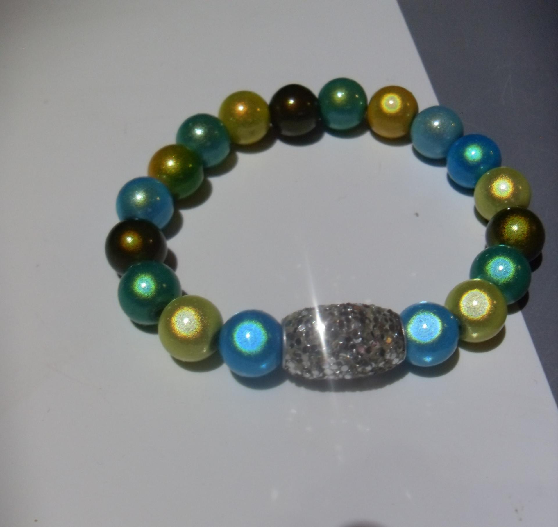 Bracelet bleu-vert-jaune, perles magiques et paillettes.