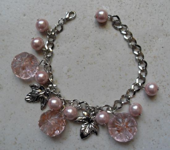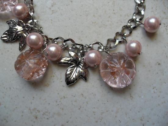 Bracelet chaîne avec des perles fleurs en verre rose et perles rondes.