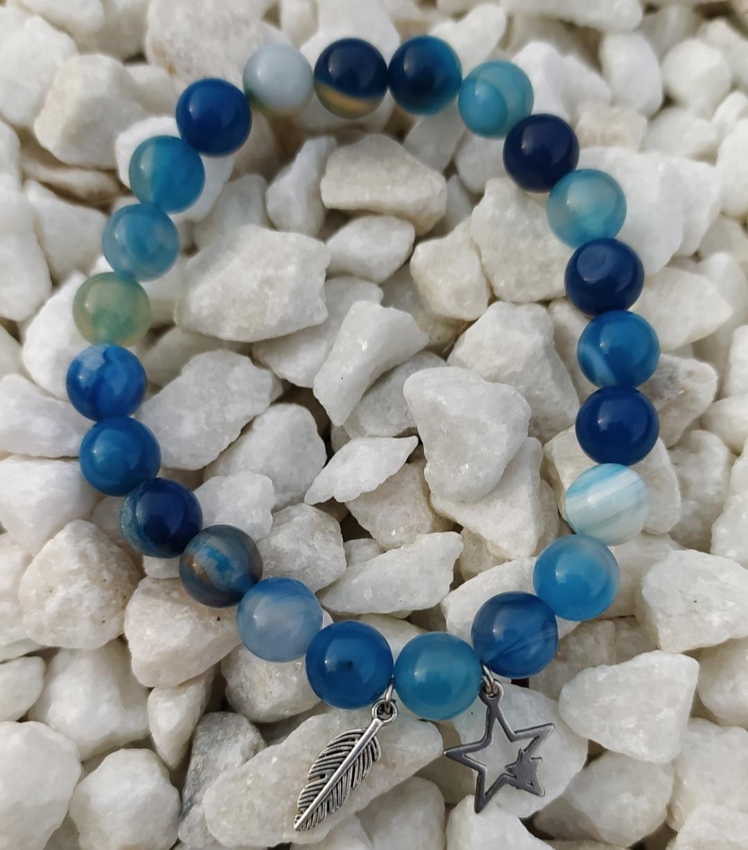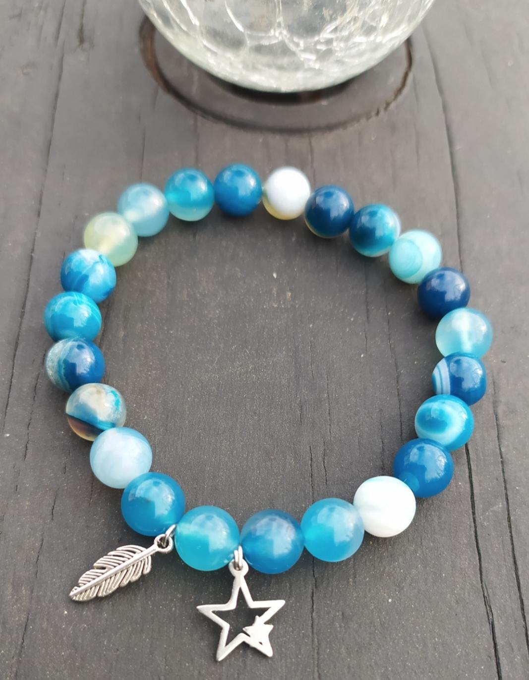 Bracelet en pierres naturelles, agates bleues, plume et étoile acier, élastiqué. Daphné créations.