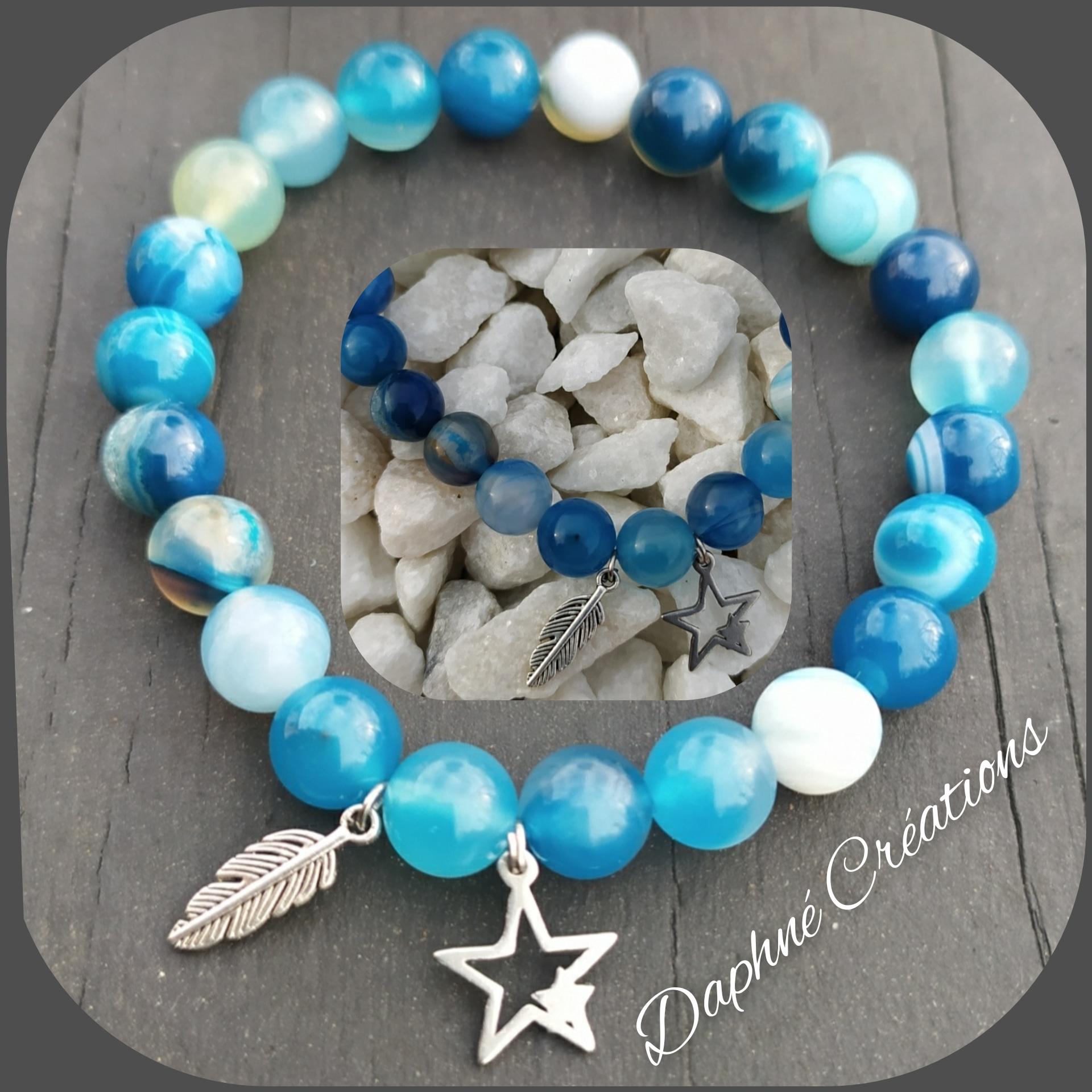 création artisanale élastiqué agate bleue étoile pampilles plume gris acier Daphné créations bracelet mixte perles naturelles