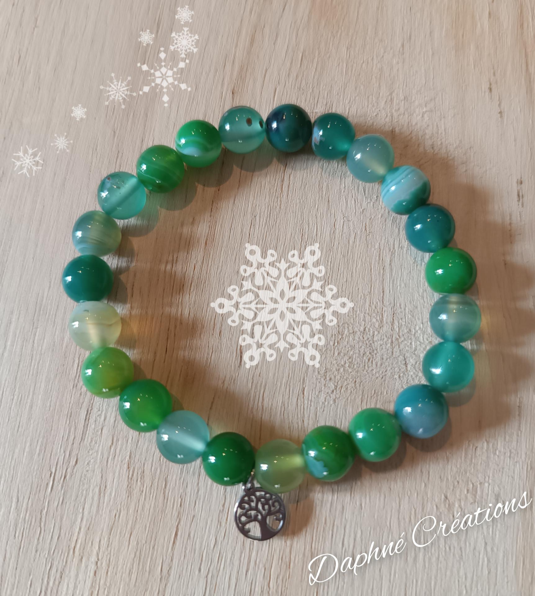 Bracelet en pierres naturelles, agates vertes, arbre de vie en acier, élastiqué. Daphné créations.