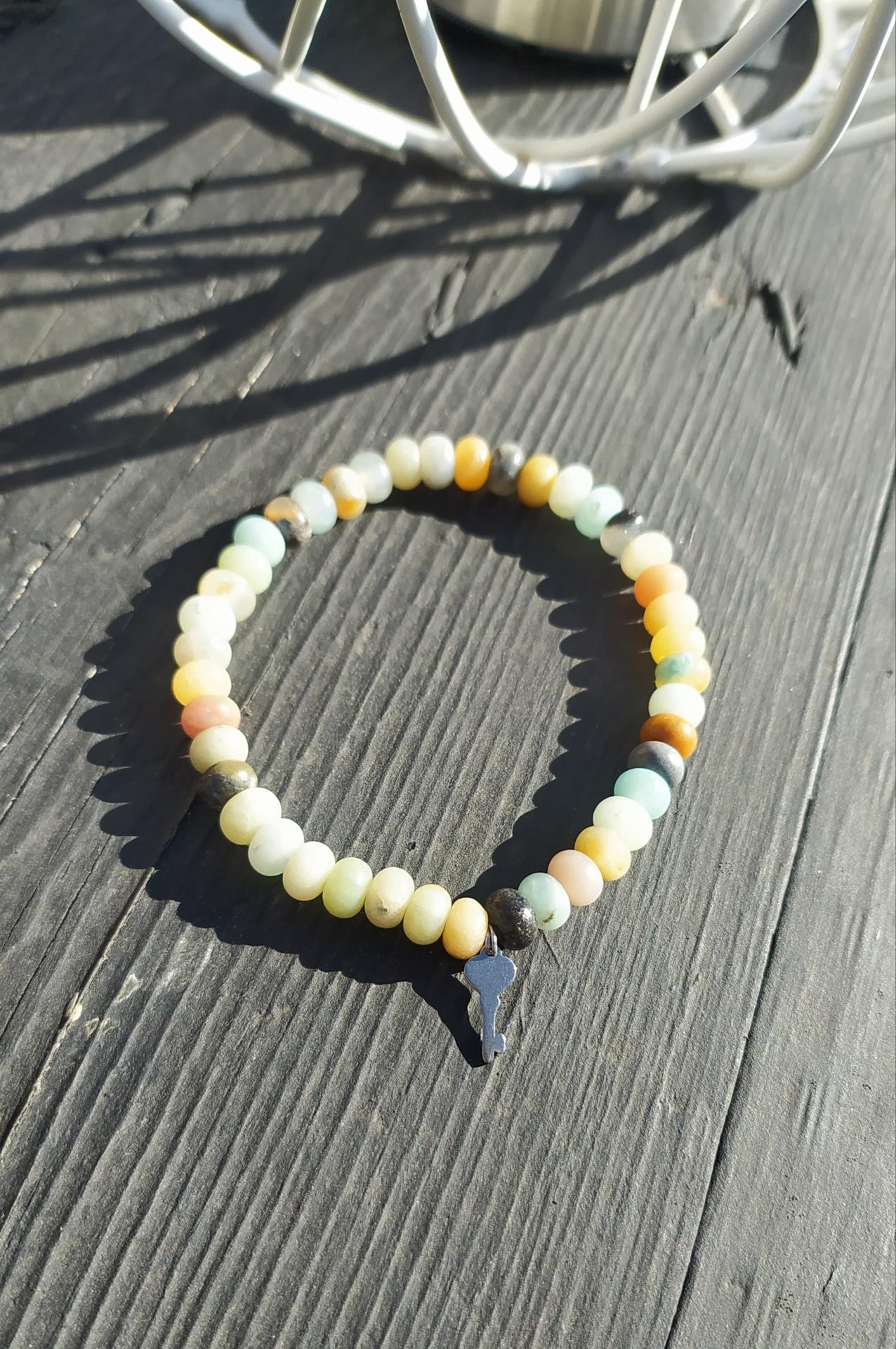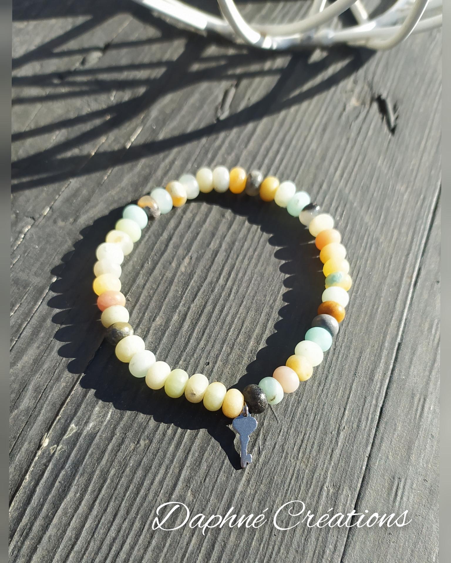 Bracelet en pierres naturelles, amazonite et clé du bonheur en acier inoxydable, élastiqué. Daphné créations.