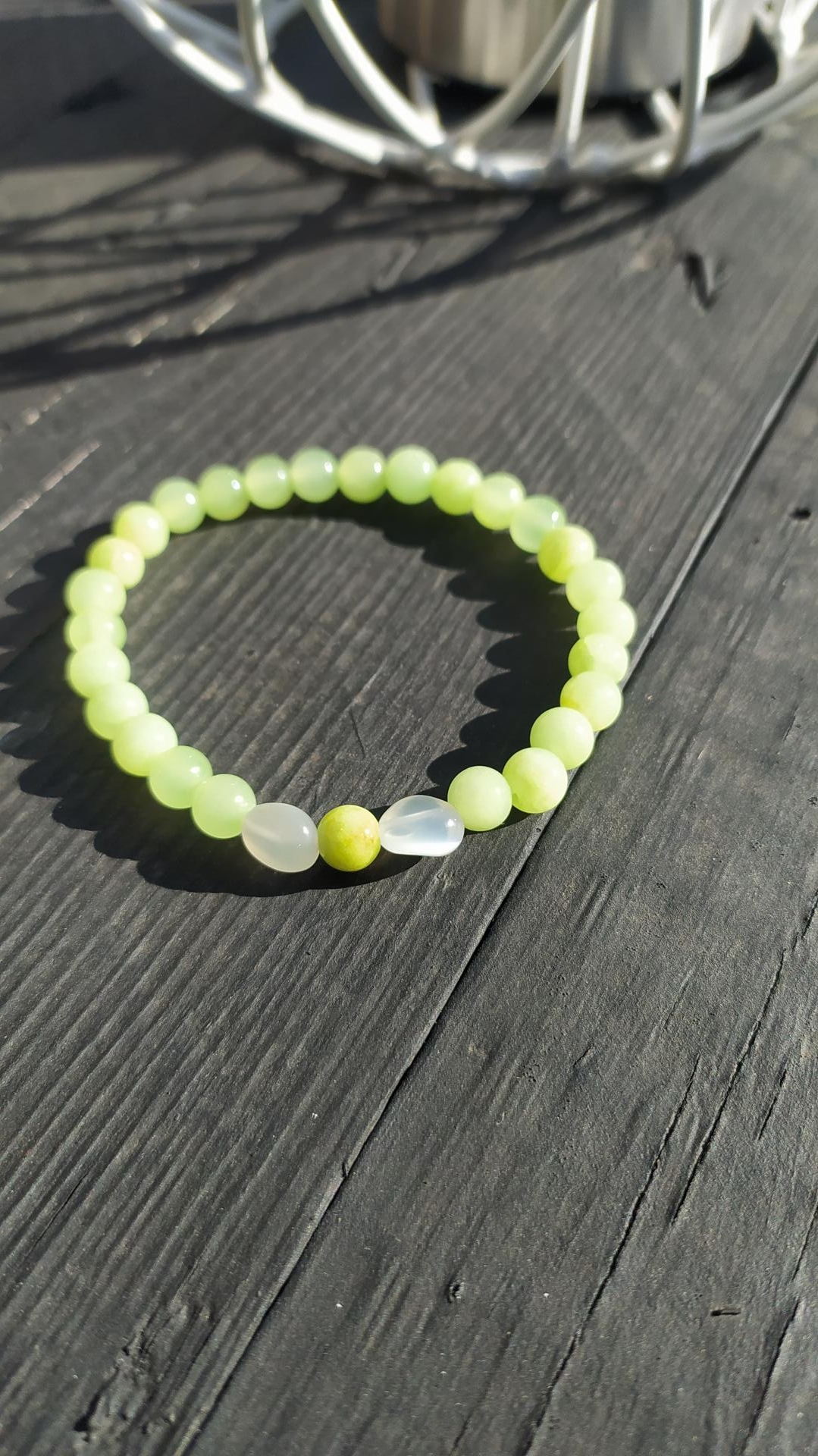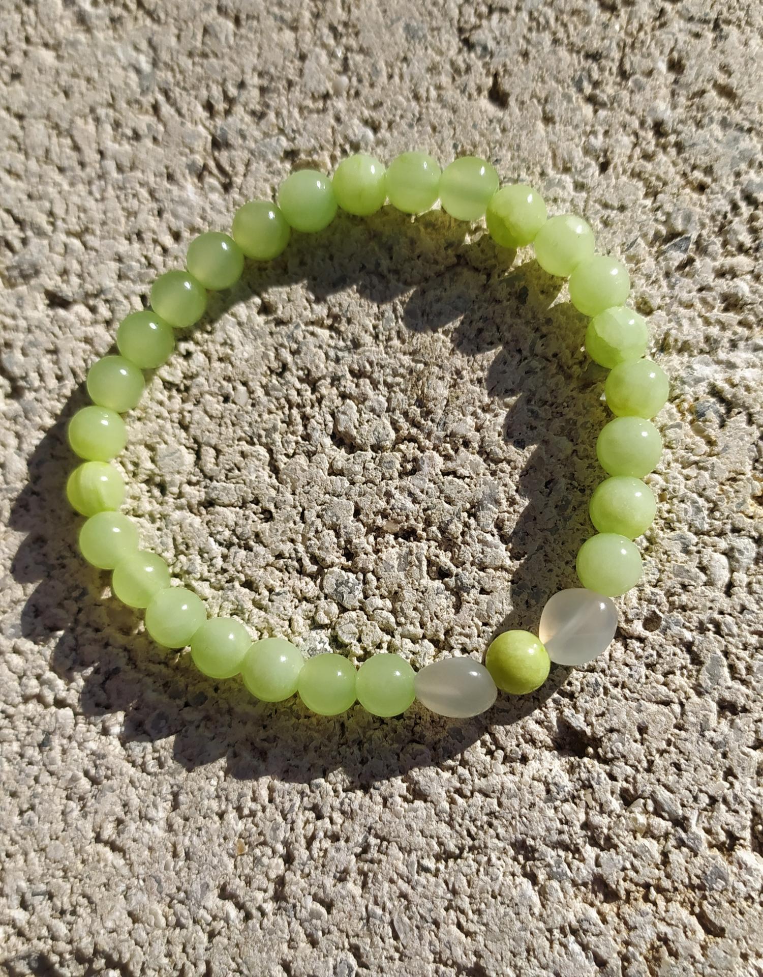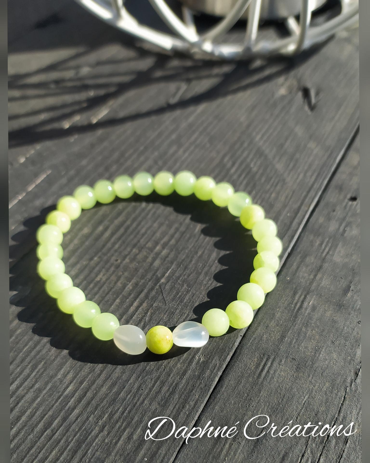Bracelet élastiqué création artisanale perles pierre de lune calme apaise jade vert blanc transparent. Daphné créations bracelet mixte perles naturelles vertu hormone ménopause féminité bien-être