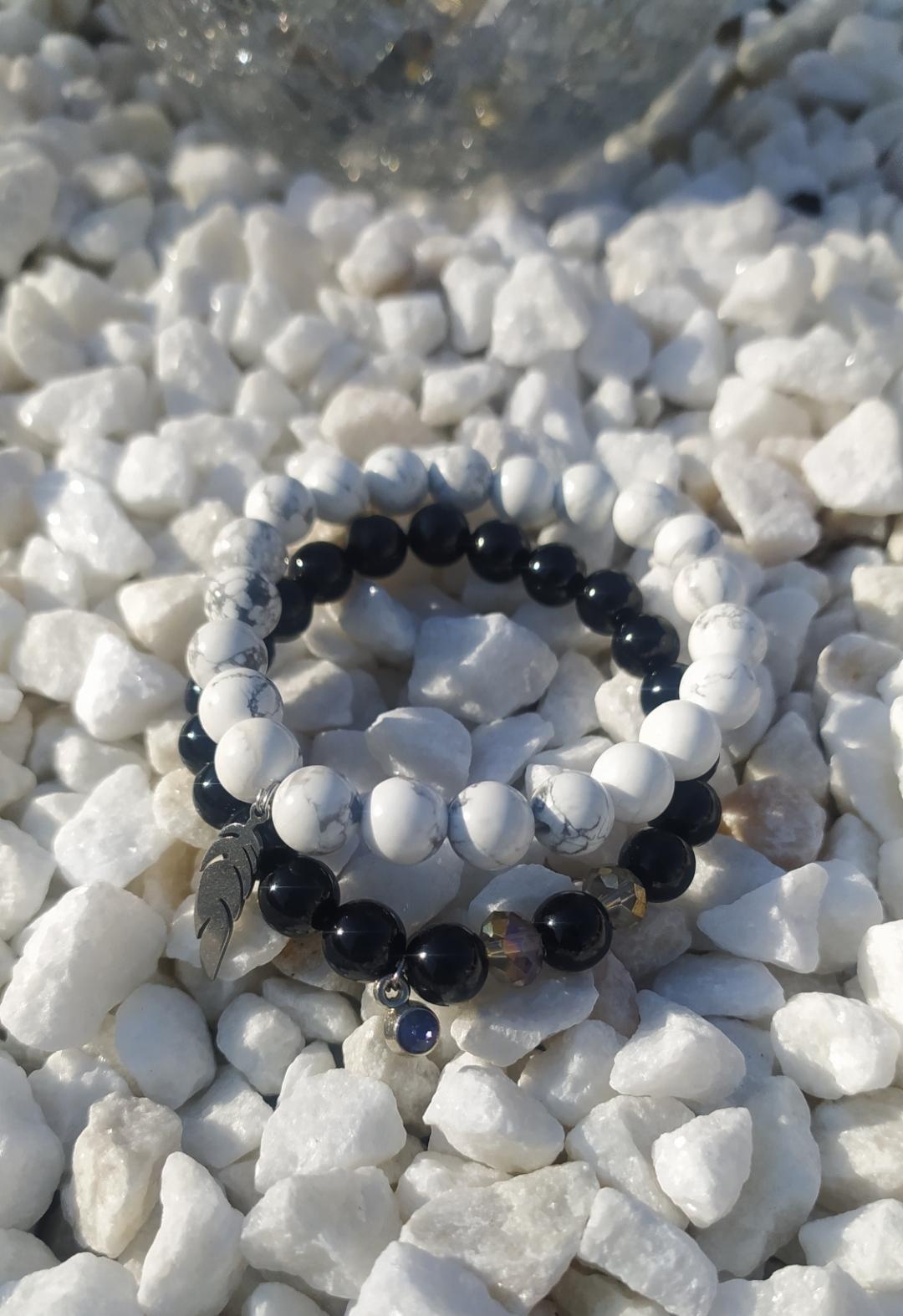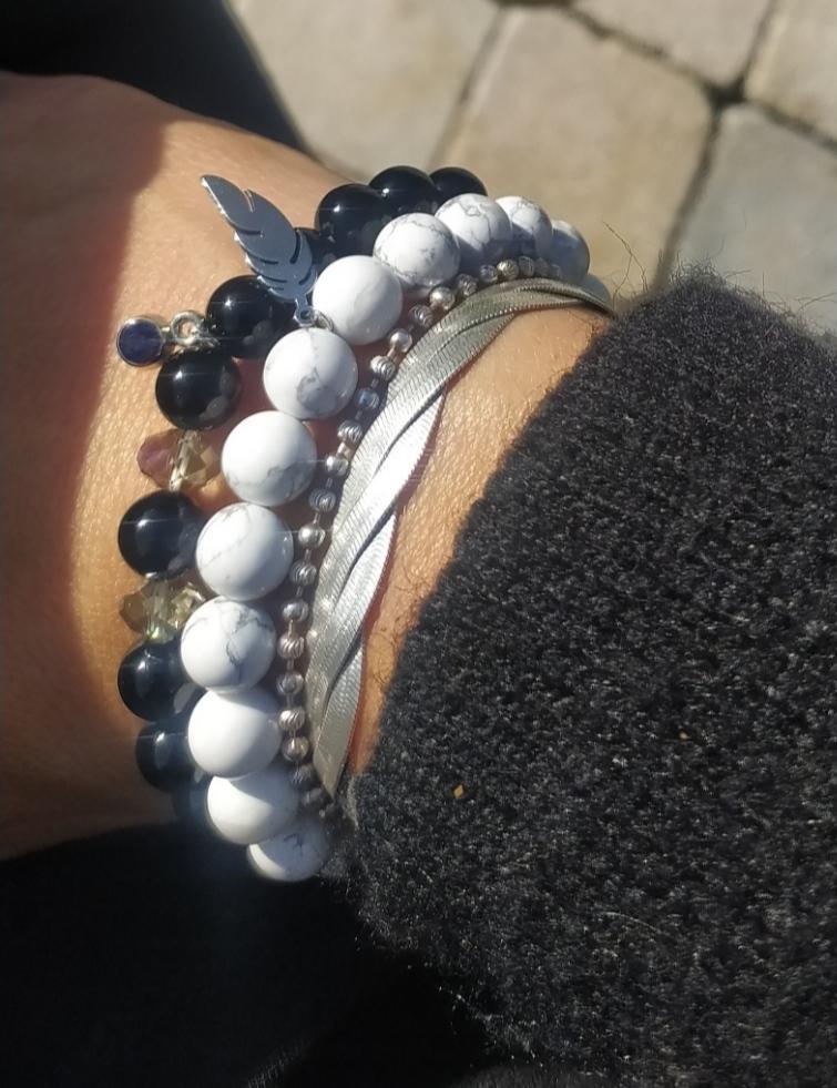 Bracelet en pierres naturelles, howlite et plume acier, élastiqué. Daphné créations. Bracelet en...28.90€ TTC