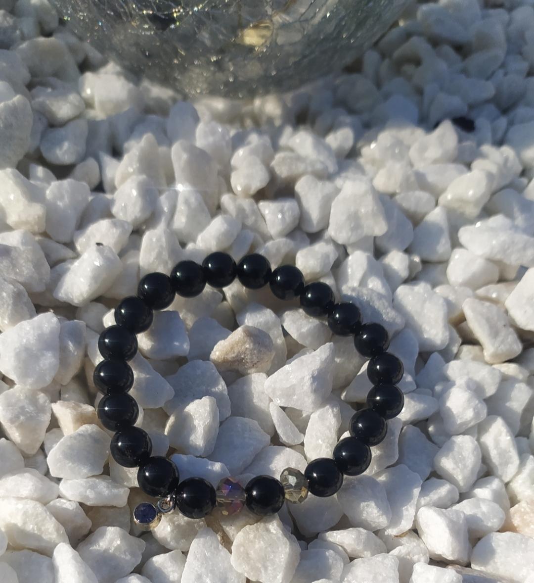 Bracelet en perles naturelles, onyx, cristal de swarovski et strass, élastiqué. Daphné créations.