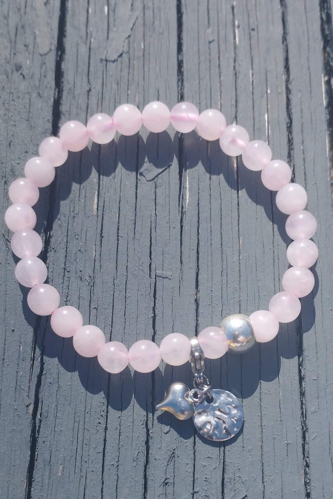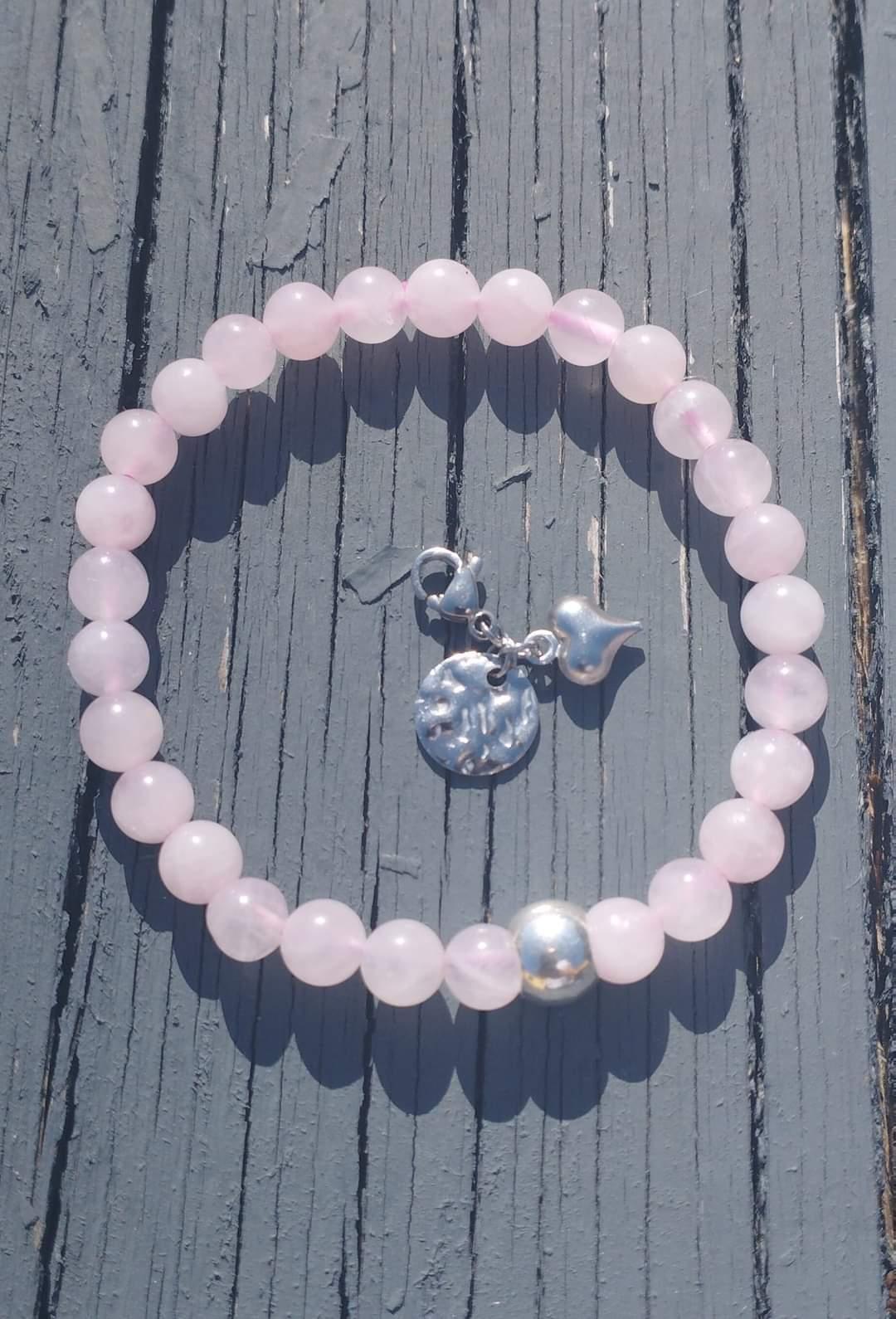 Bracelet en perles naturelles, quartz rose, pampilles cœur. et pastille