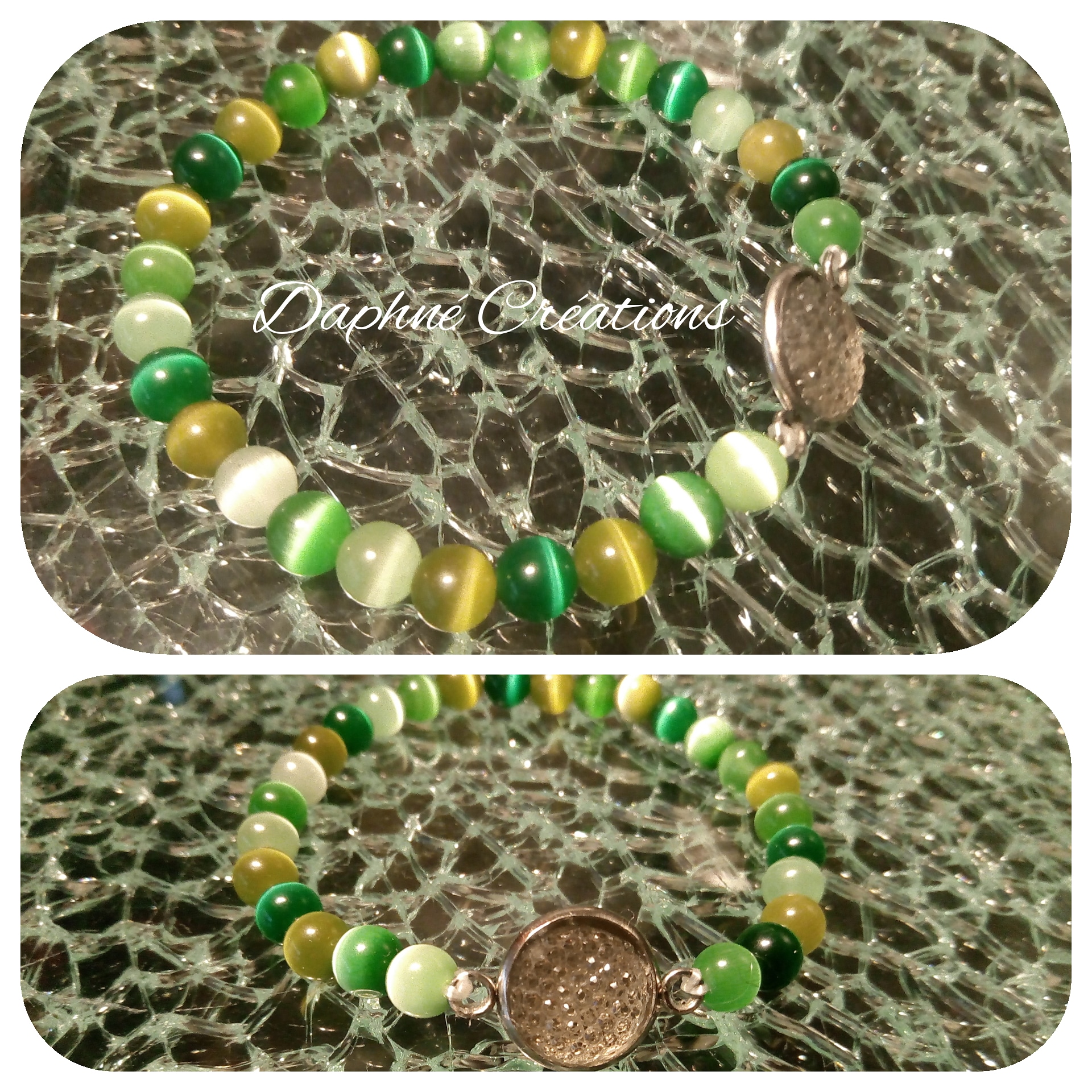 création unique perles naturelle vert Bracele Daphné créations élastiqué création artisanale cabochon blanc strass