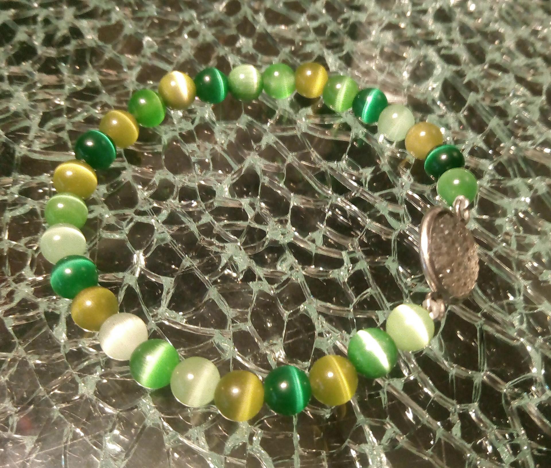 Bracelet de perles naturelles dans les tons de vert et son cabochon strass .