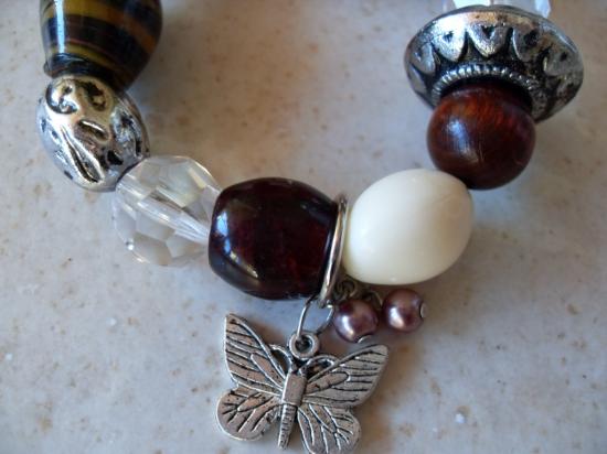 Bracelet marron, perles, papillon et pampilles.