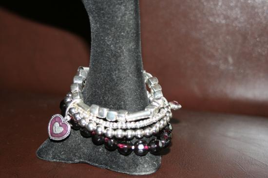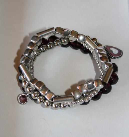 Bracelet multirangs, perles, métal argenté, prune et coeur émail.