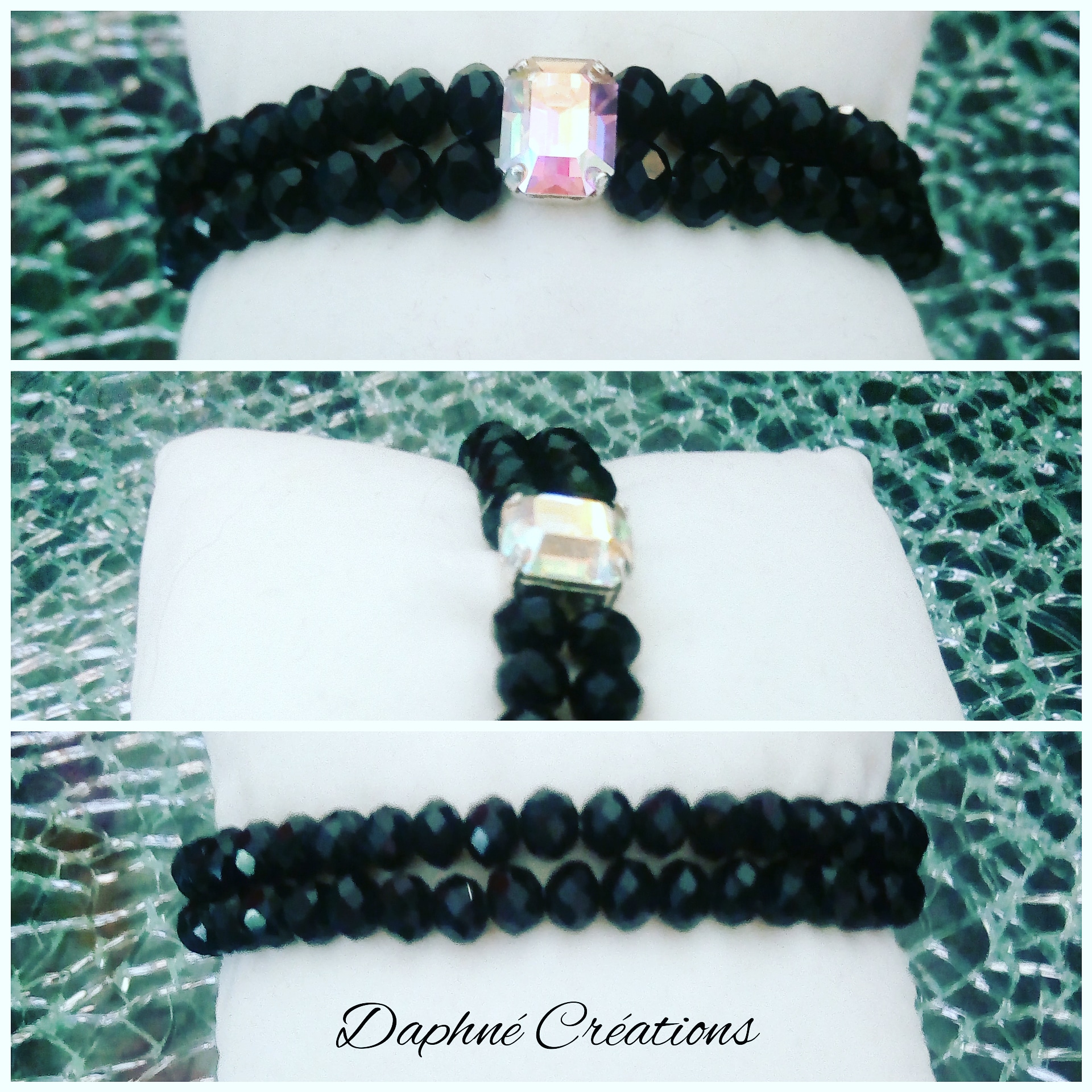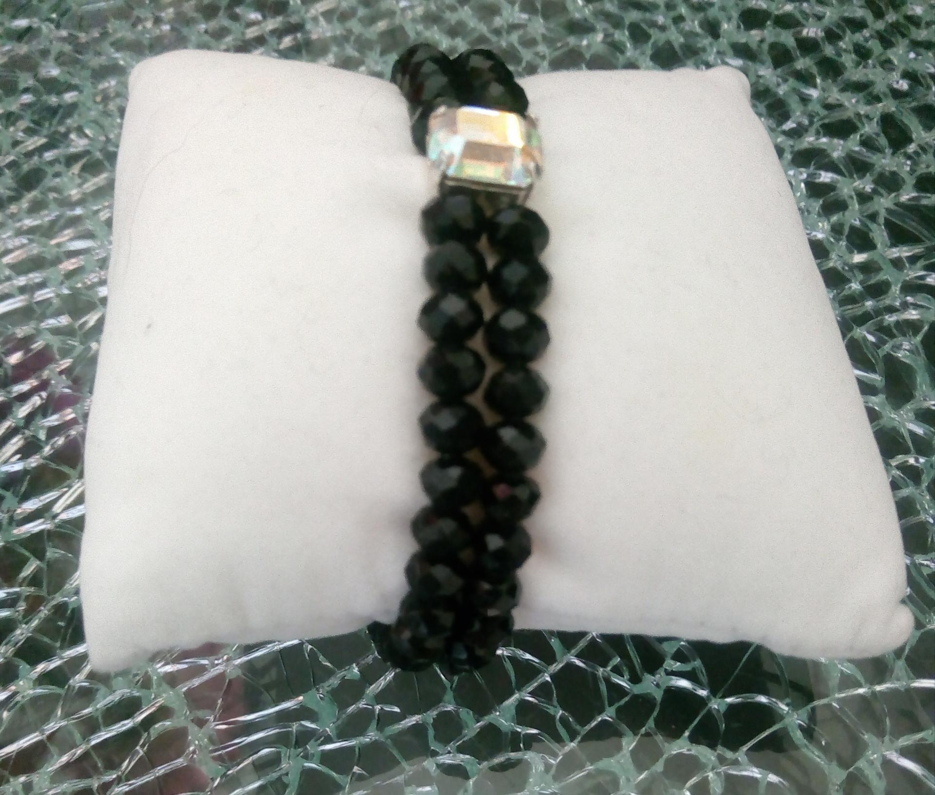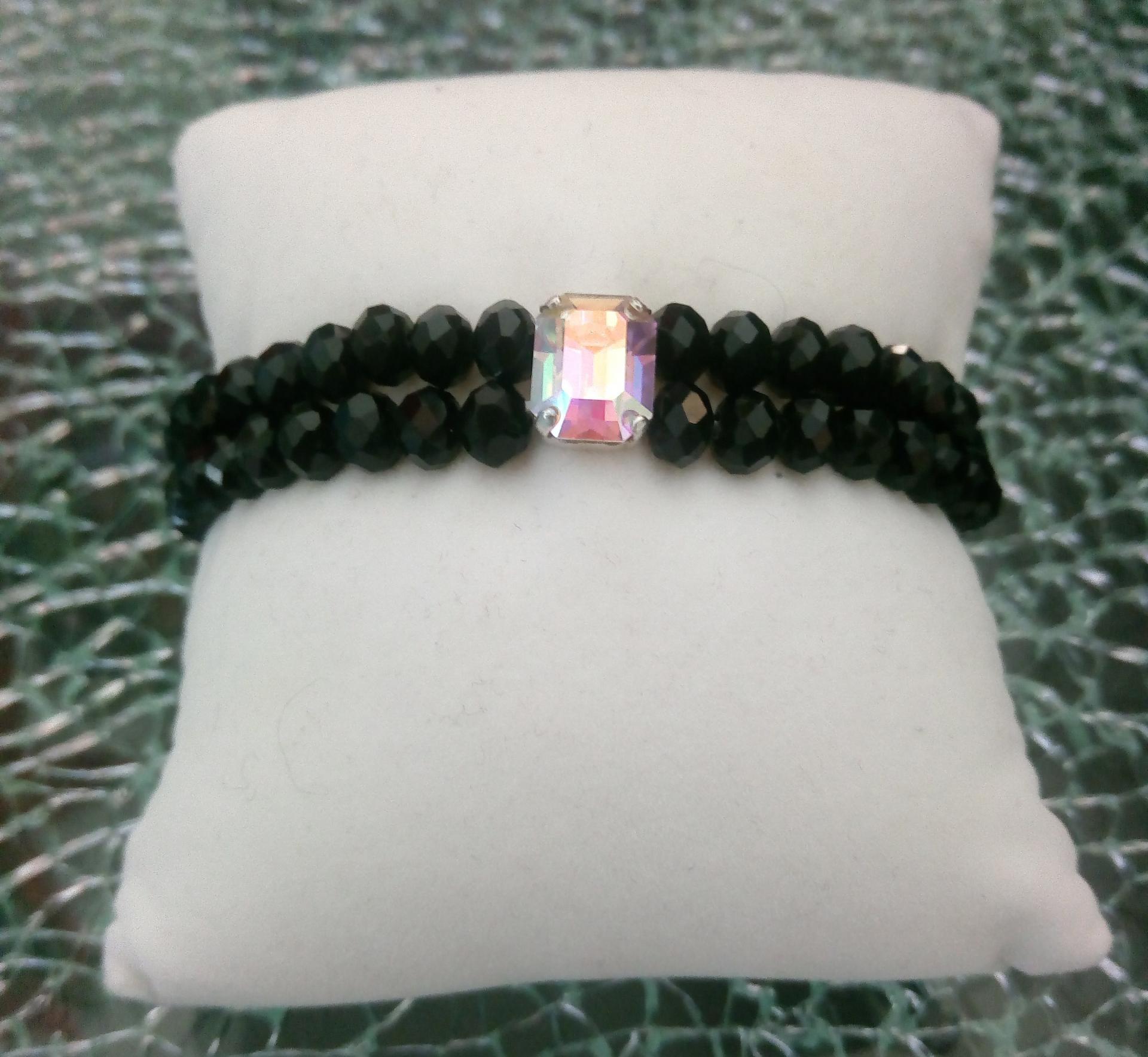 Bracelet noir, 2 rangs de perles verre et cabochon strass. création artisanale unique.