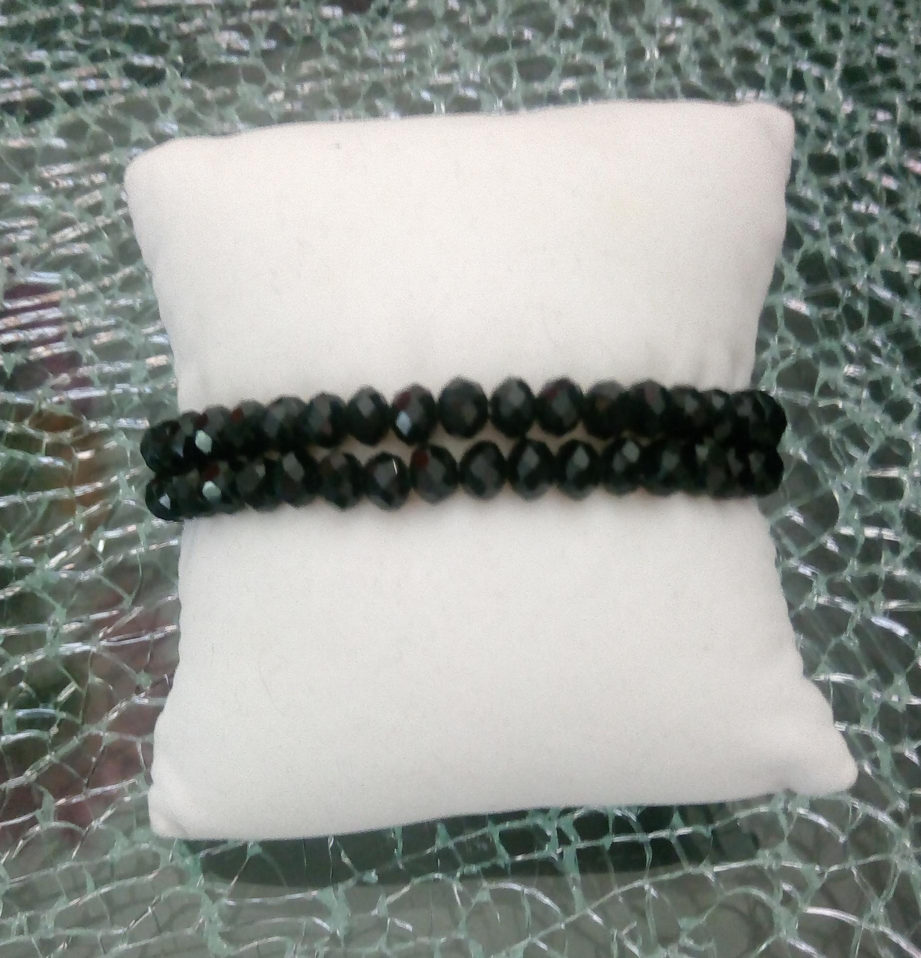 Bracelet élastiqué, noir, 2 rangs de perles verre et cabochon strass.