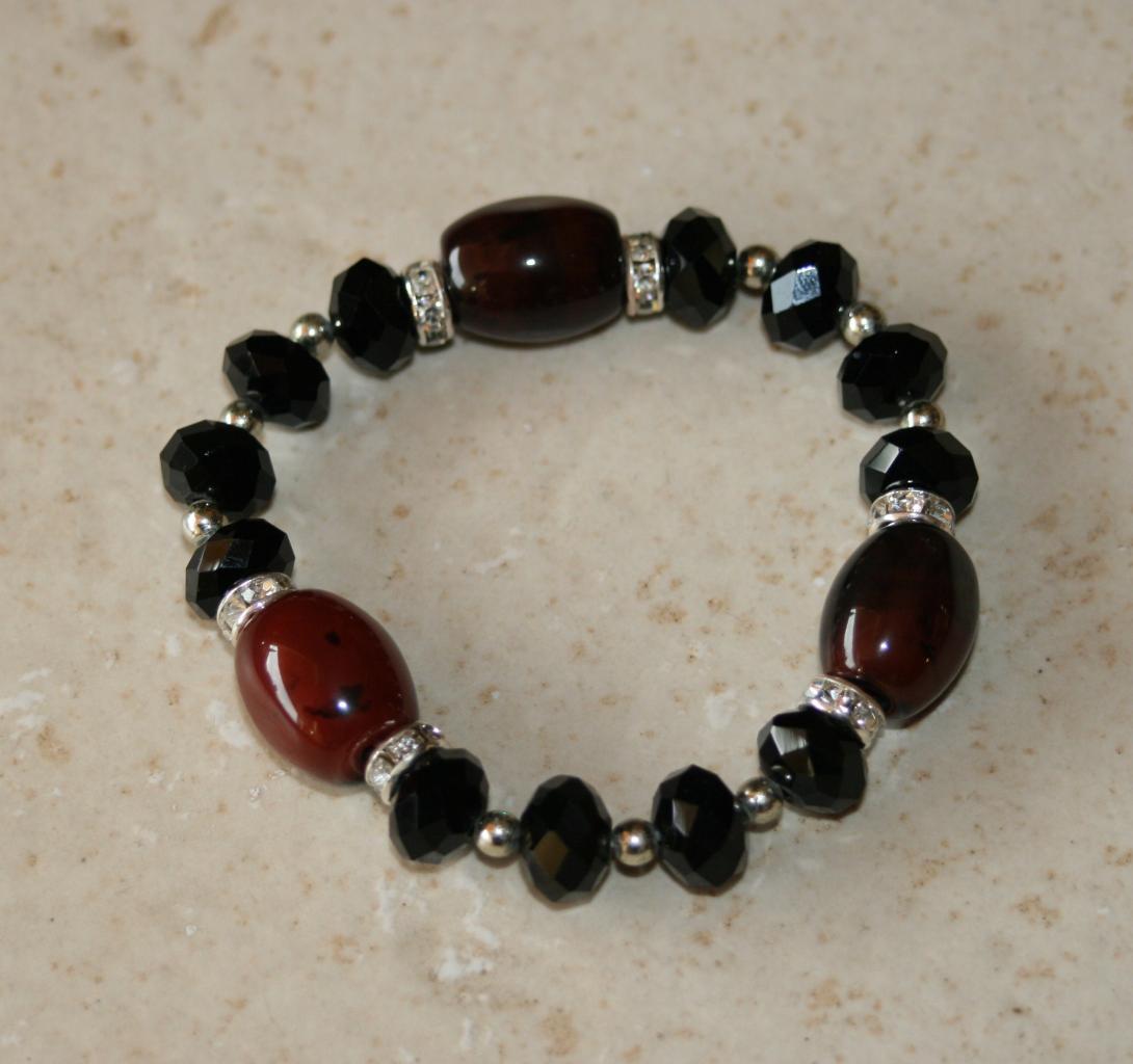 Bracelet élastiqué noir et marron en perles, cristal de swarovski, strass et porcelaine.