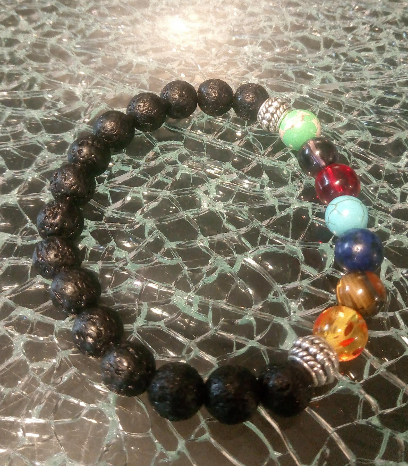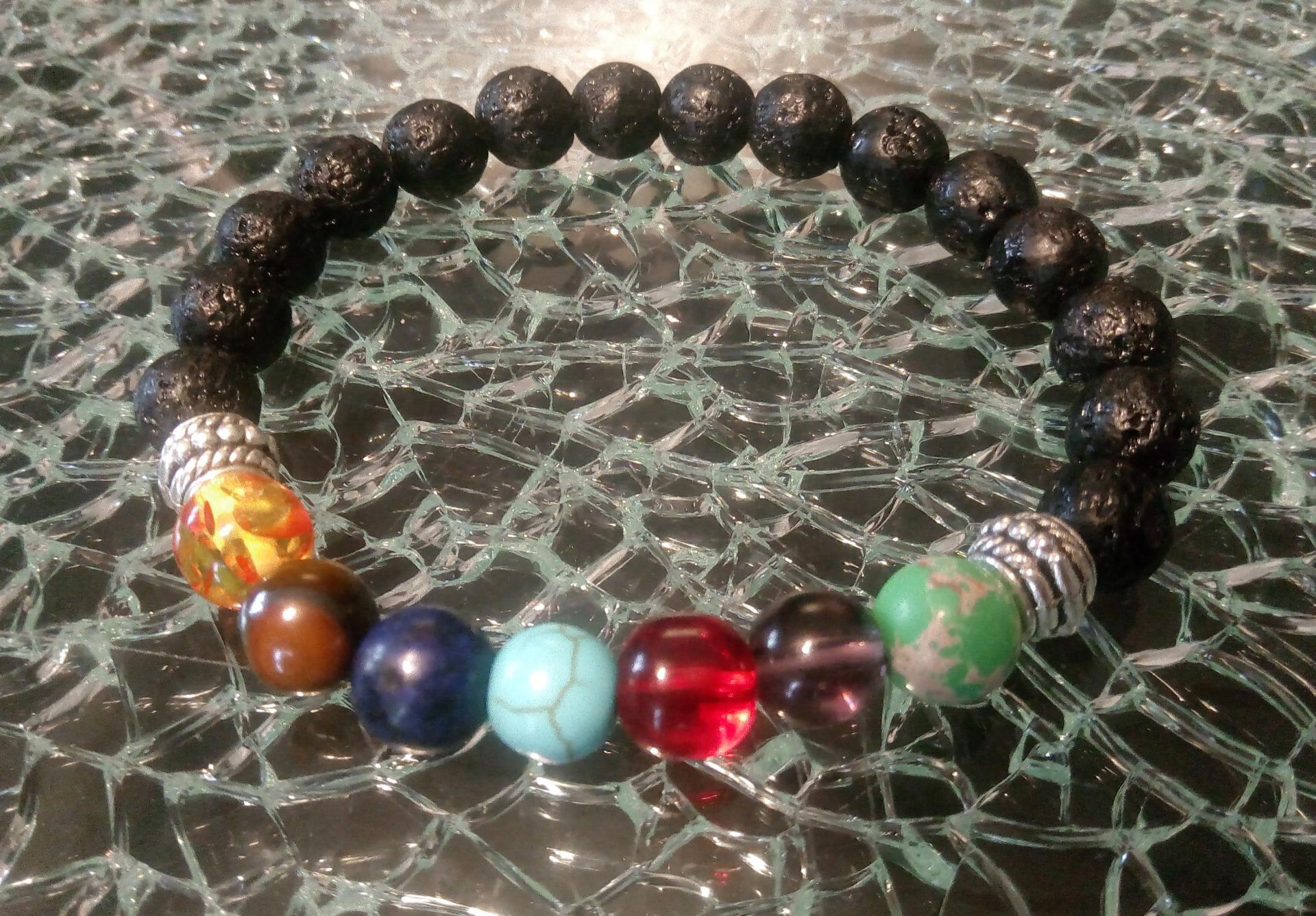 Bracelet de perles, perles de lave noir et perles 7 chakras.