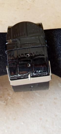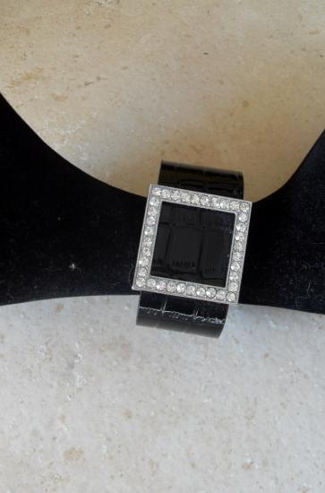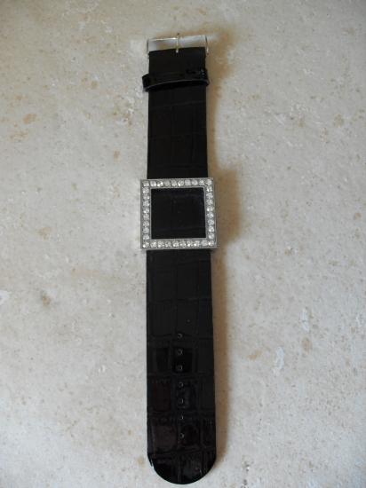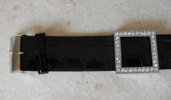 Bracelet large en simili cuir noir, et carré en strass. Fermeture boucle, façon ceinture.