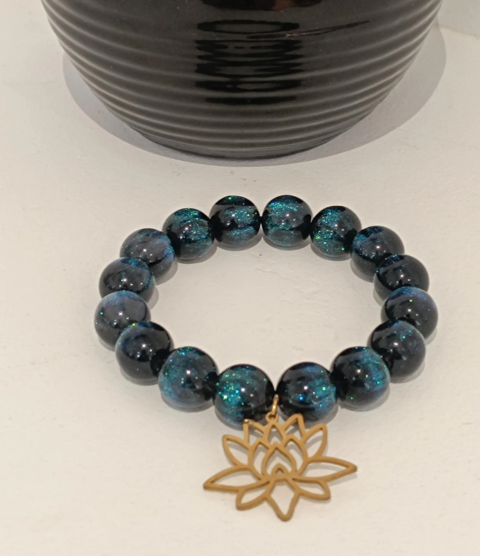 Bracelet en perles bleu nuit avec paillettes et fleur de lotus.