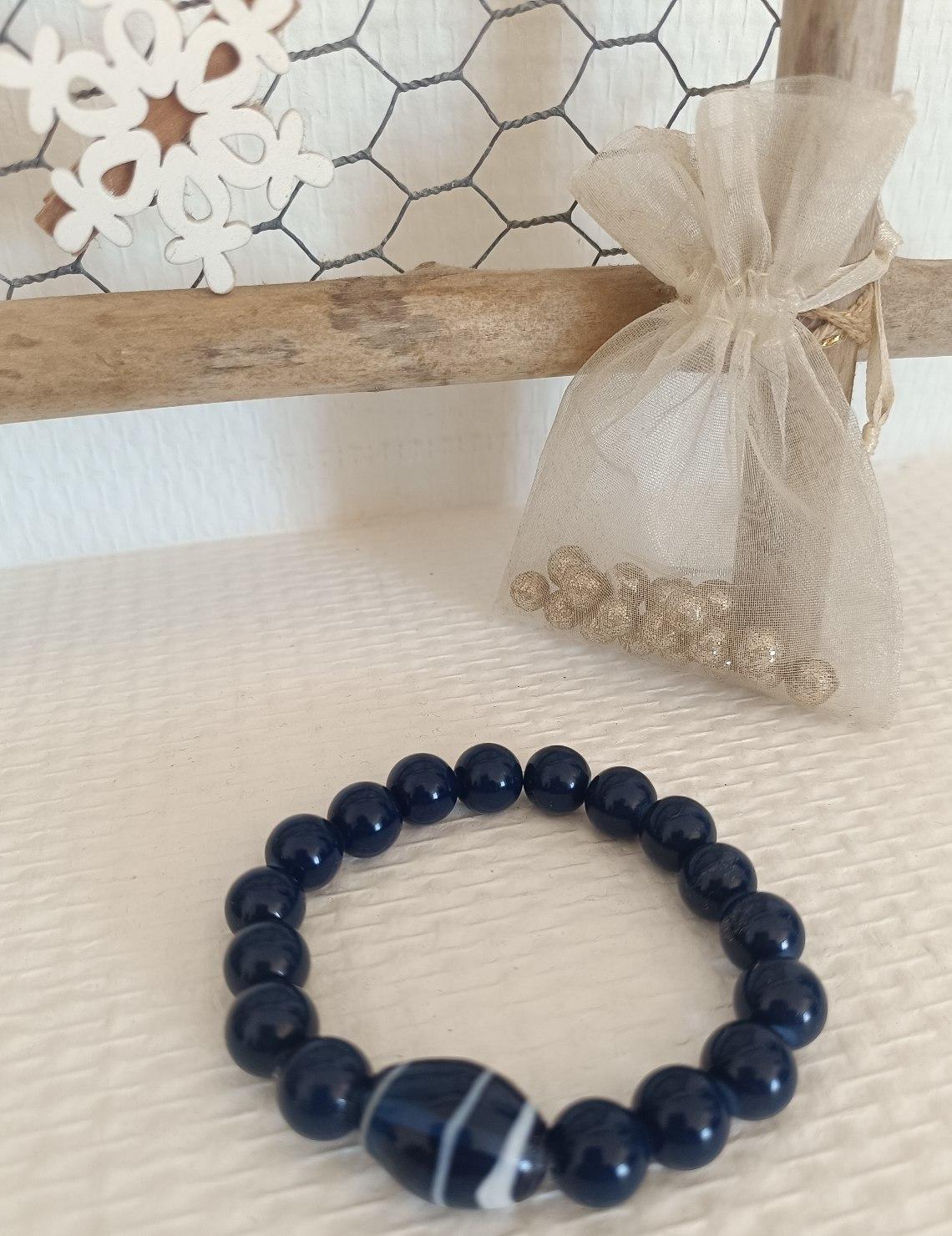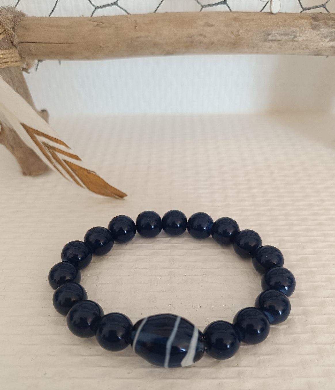 Bracelet élastiqué, en perles de verre bleu, 10 mm avec sa grosse perle ovale bleu et petit liseret blanc.