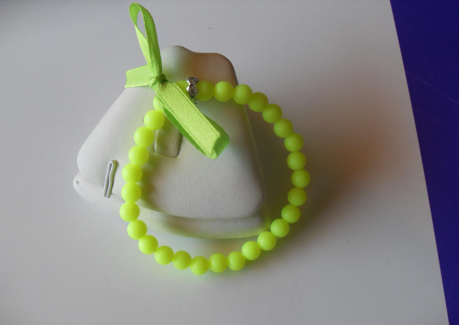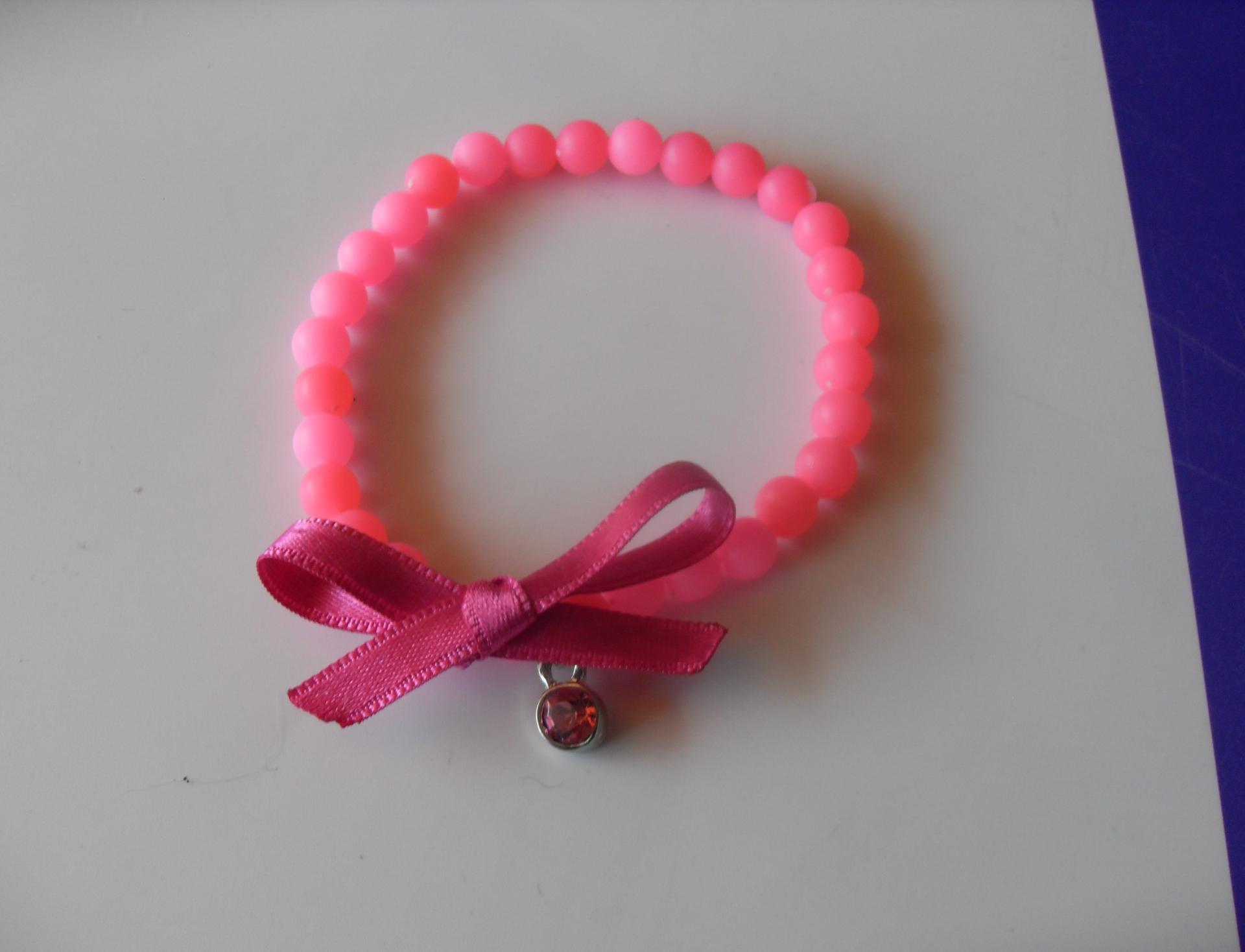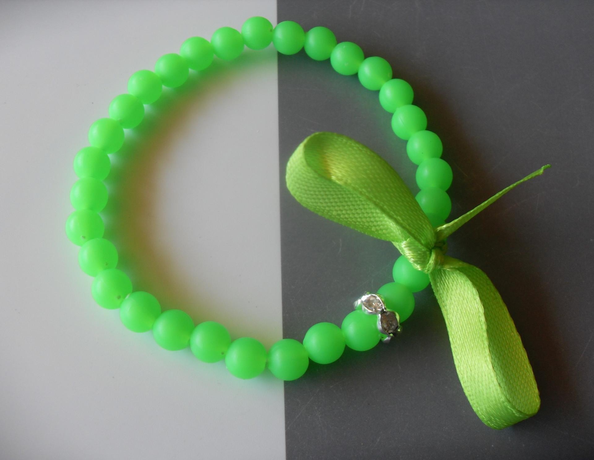 Bracelet élastiqué en perles fluo effet glacé (6mm), strass et ruban.
